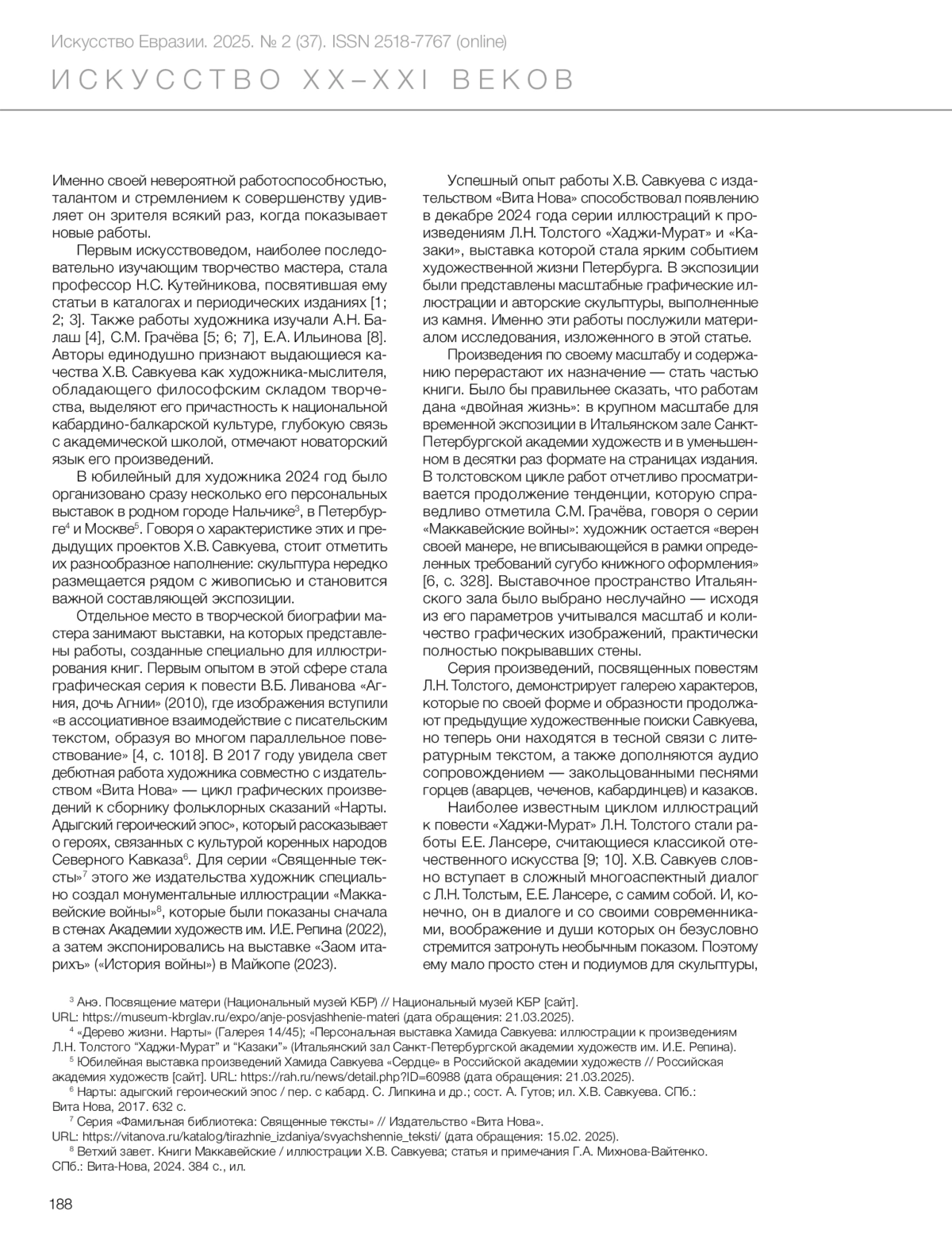 6. Грачёва С.М. “Маккавейские войны” в творчестве Хамида Савкуева // Отечественное искусство конца XIX - начала XXI в. в диалоге эпох: идеи, стили, мастера / сост.: А.В. Карпов, Н.Н. Мутьян. СПб.: СПГХПА имени А.Л. Штиглица, 2022. С. 325-334.