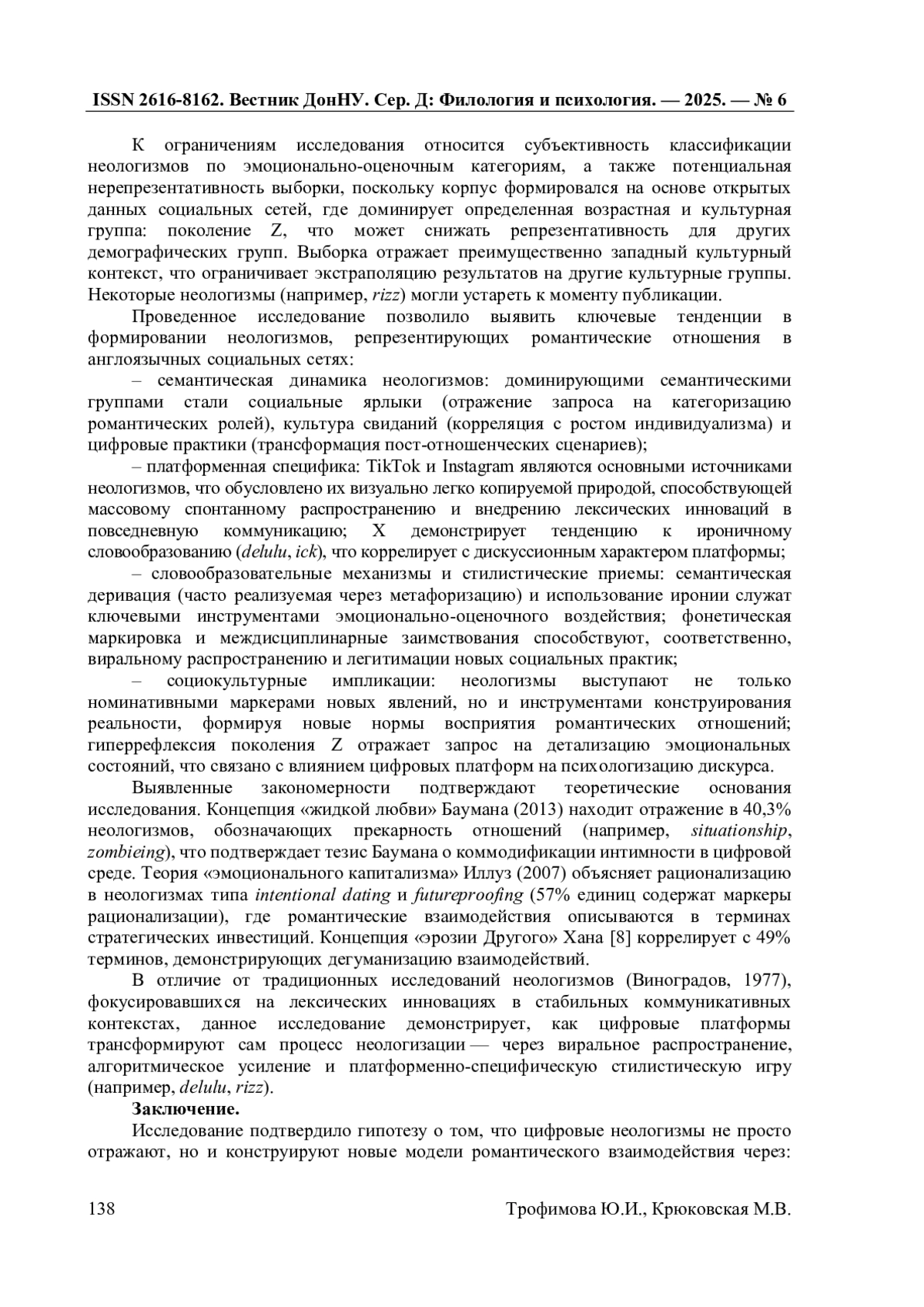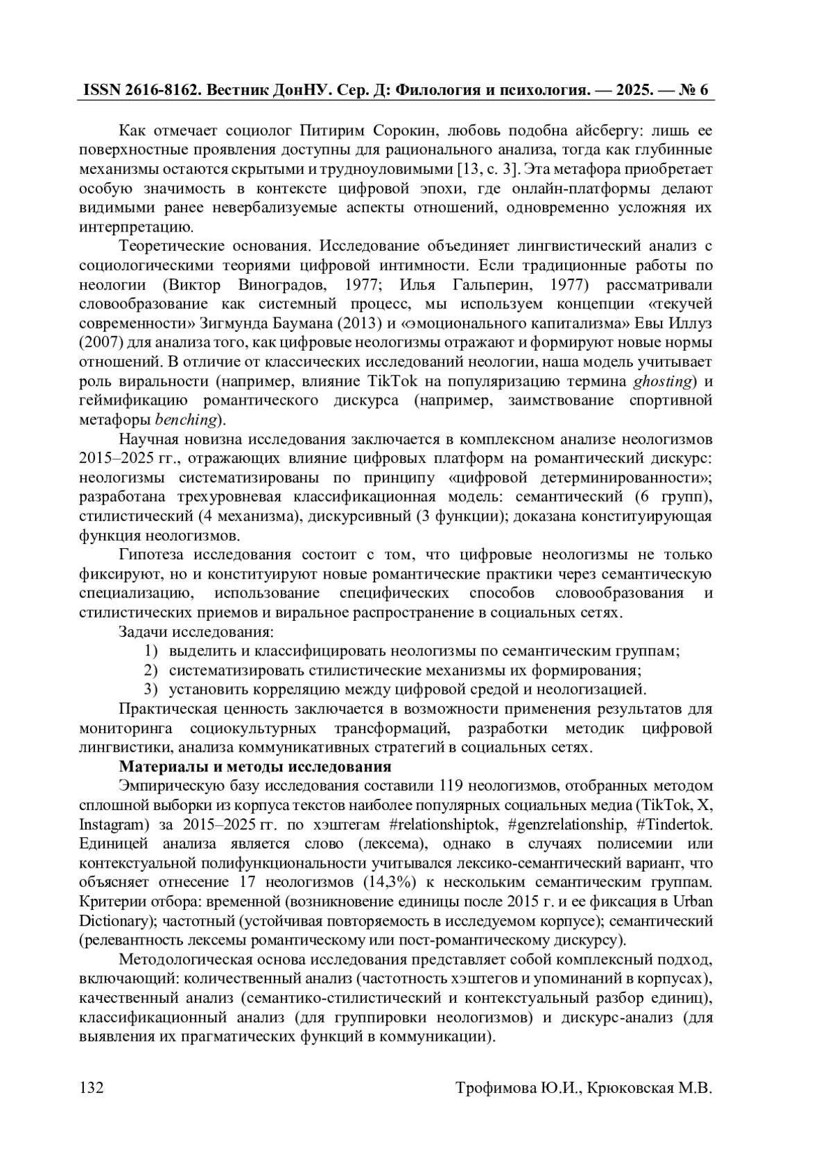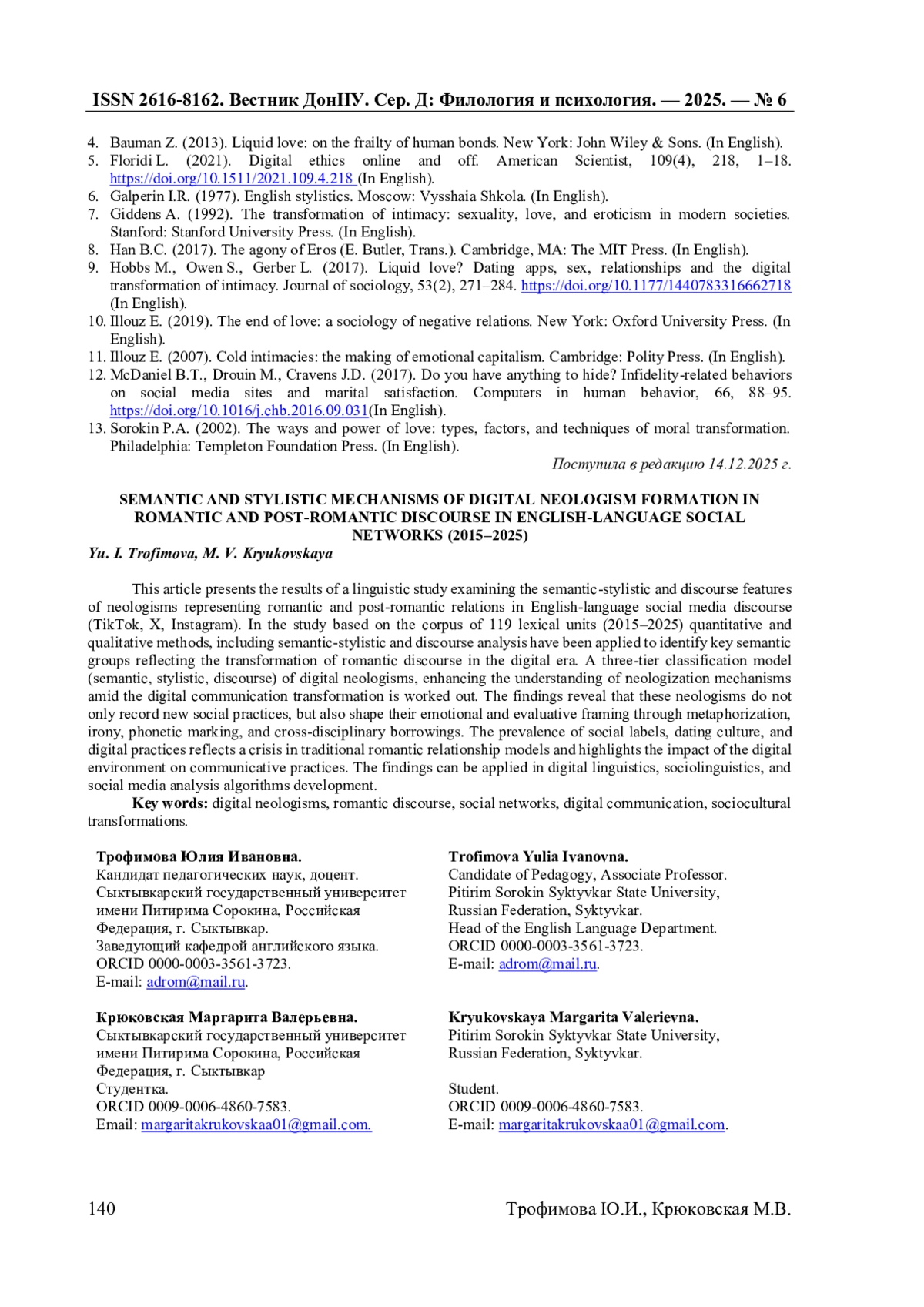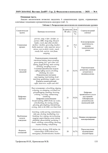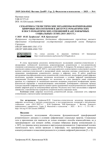 В статье представлены результаты лингвистического исследования семантико-стилистических и дискурсивных особенностей неологизмов, репрезентирующих романтические и пост-романтические отношения в англоязычном дискурсе социальных сетей (TikTok, X, Instagram). На материале корпуса из 119 лексических единиц за период 2015-2025 гг., методами корпусного, количественного и качественного анализа, включая семантико-стилистический и дискурсивный анализ, выделены ключевые семантические группы, отражающие трансформацию романтического дискурса в цифровую эпоху. В работе разработана трехуровневая классификационная модель (семантический, стилистический, дискурсивные уровни) цифровых неологизмов, расширяя понимание механизмов неологизации в условиях цифровой трансформации коммуникации. Результаты демонстрируют, что неологизмы не только фиксируют новые социальные практики, но и формируют их эмоционально-оценочное восприятие посредством метафоризации, иронии, фонетической маркировки и междисциплинарных заимствований. Доминирование социальных ярлыков, культуры свиданий и цифровых практик отражает кризис традиционных моделей романтических отношений и влияние цифровой среды на коммуникативные практики. Результаты могут быть использованы в цифровой лингвистике, социолингвистике и разработке алгоритмов анализа социальных медиа.