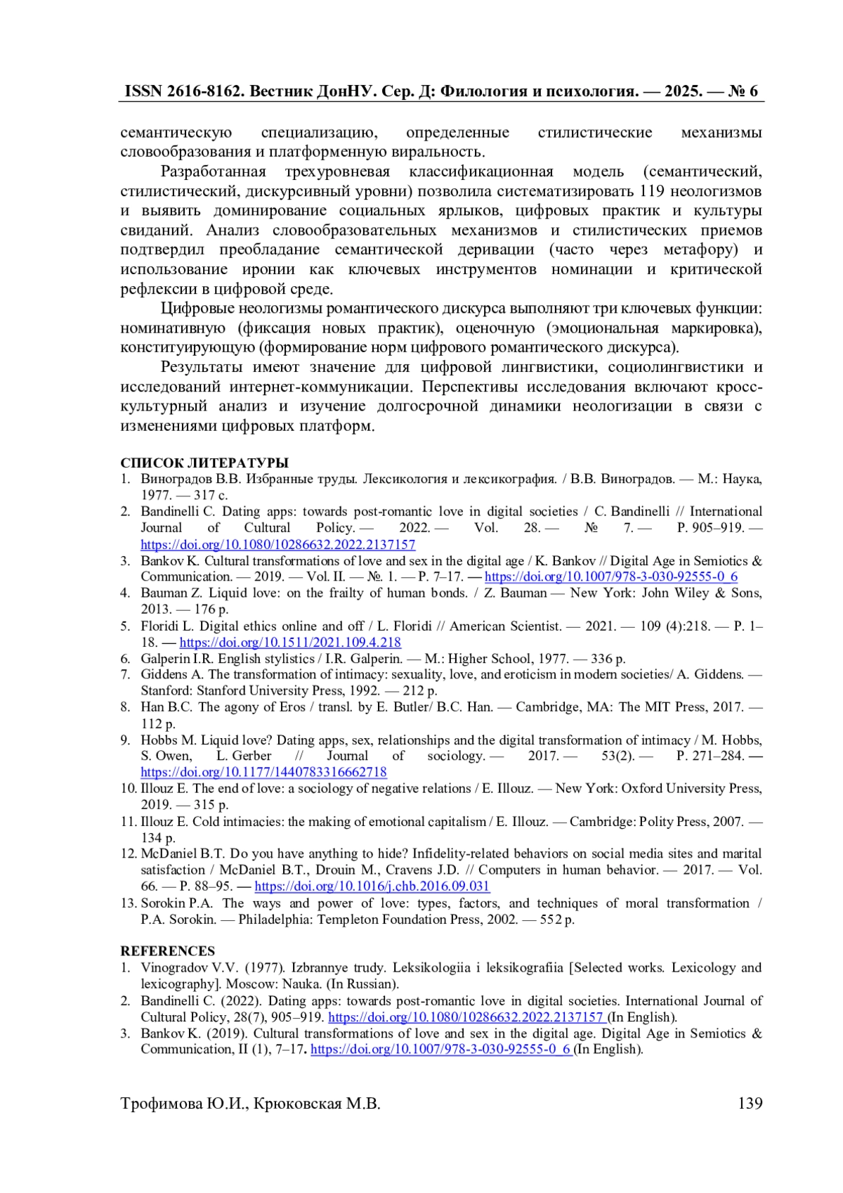2. Bandinelli C. Dating apps: towards post-romantic love in digital societies / C. Bandinelli // International Journal of Cultural Policy. - 2022. - Vol. 28. - № 7. - P. 905-919. -. DOI: 10.1080/10286632.2022.2137157