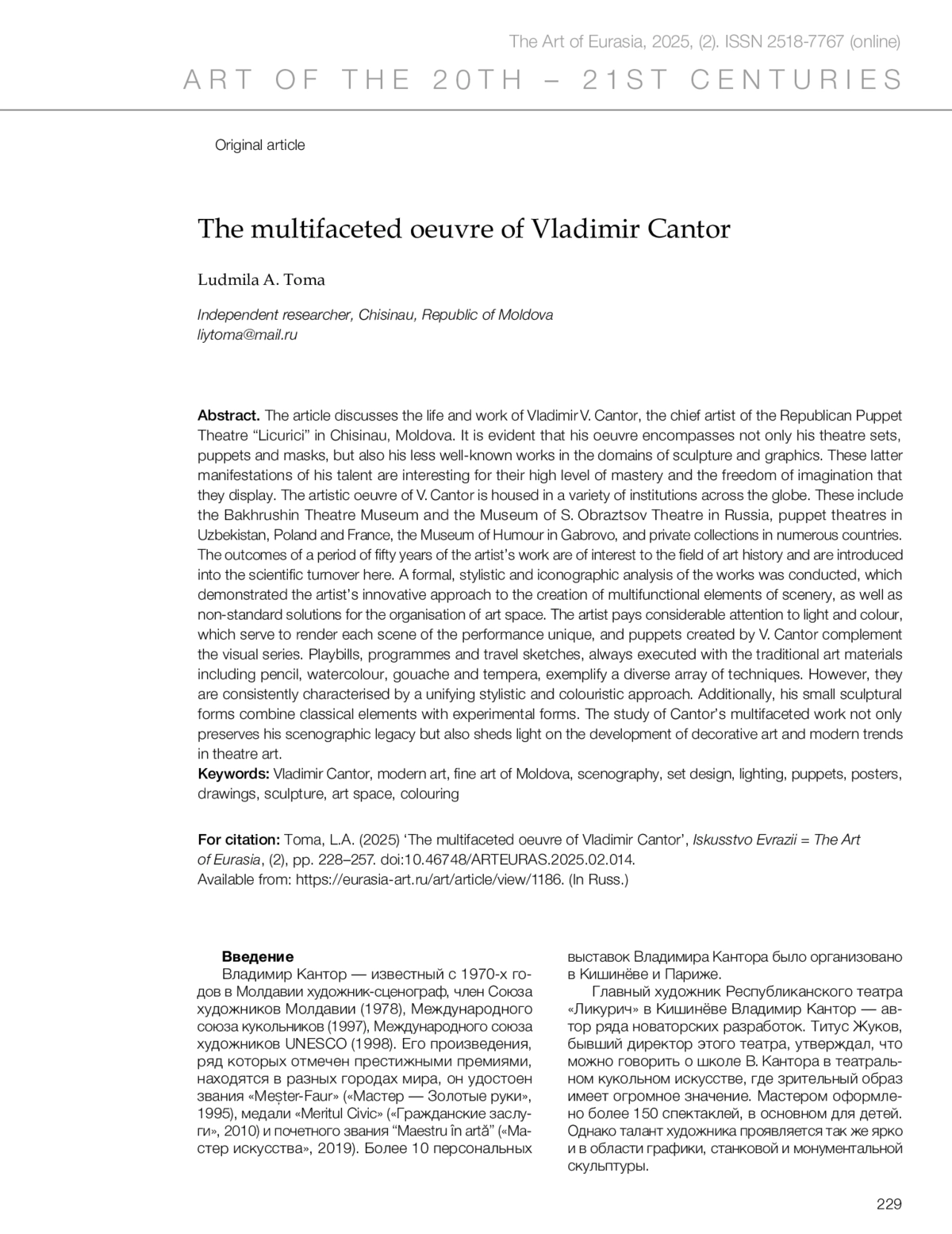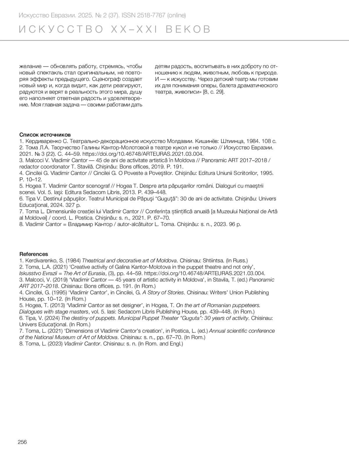 2. Toma, L.A. (2021) ‘Creative activity of Galina Kantor‑Molotova in the puppet theatre and not only’, *Iskusstvo Evrazii = The Art of Eurasia*, (3), pp. 44–59. doi:10.46748/ARTEURAS.2021.03.004.