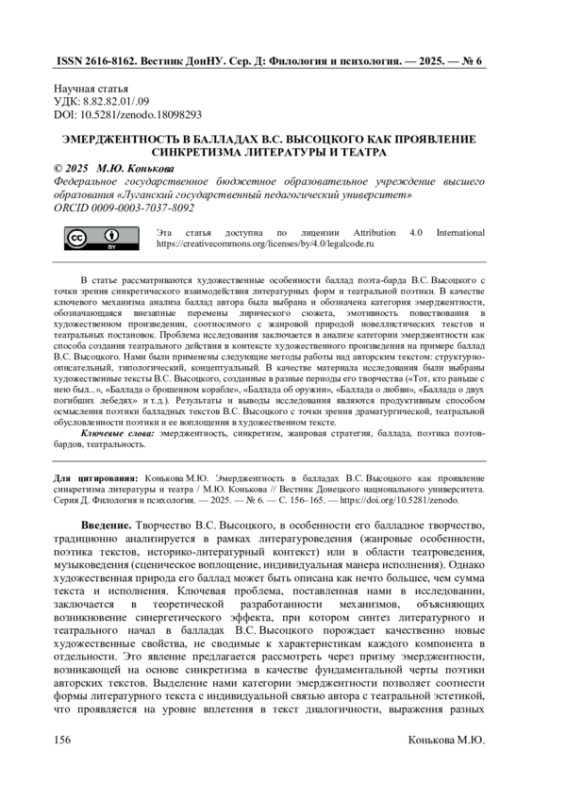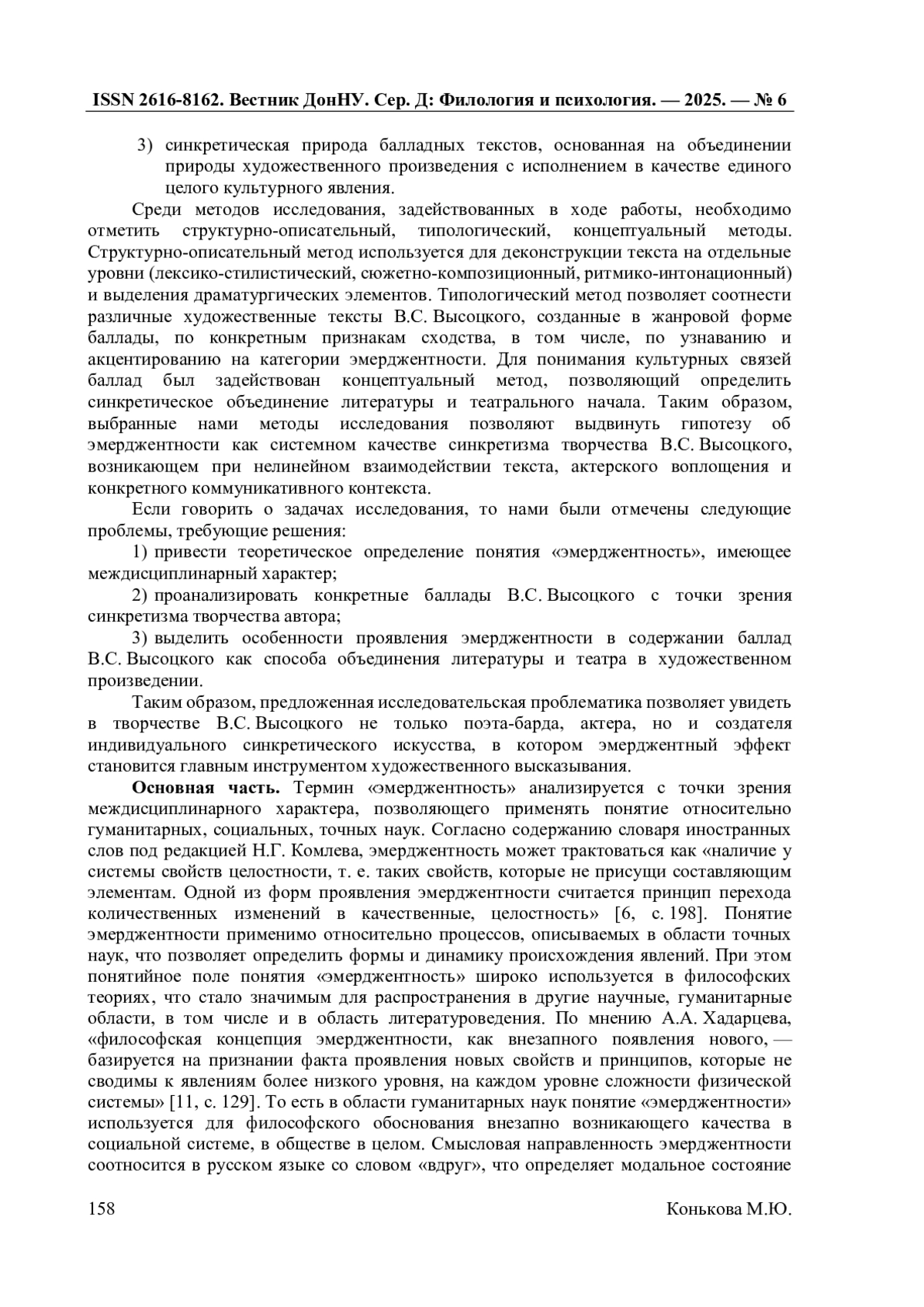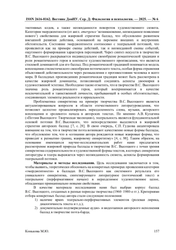 В статье рассматриваются художественные особенности баллад поэта-барда В. С. Высоцкого с точки зрения синкретического взаимодействия литературных форм и театральной поэтики. В качестве ключевого механизма анализа баллад автора была выбрана и обозначена категория эмерджентности, обозначающаяся внезапные перемены лирического сюжета, эмотивность повествования в художественном произведении, соотносимого с жанровой природой новеллистических текстов и театральных постановок. Проблема исследования заключается в анализе категории эмерджентности как способа создания театрального действия в контексте художественного произведения на примере баллад В. С. Высоцкого. Нами были применены следующие методы работы над авторским текстом: структурно-описательный, типологический, концептуальный. В качестве материала исследования были выбраны художественные тексты В. С. Высоцкого, созданные в разные периоды его творчества («Тот, кто раньше с нею был…», «Баллада о брошенном корабле», «Баллада об оружии», «Баллада о любви», «Баллада о двух погибших лебедях» и т. д.). Результаты и выводы исследования являются продуктивным способом осмысления поэтики балладных текстов В. С. Высоцкого с точки зрения драматургической, театральной обусловленности поэтики и ее воплощения в художественном тексте.