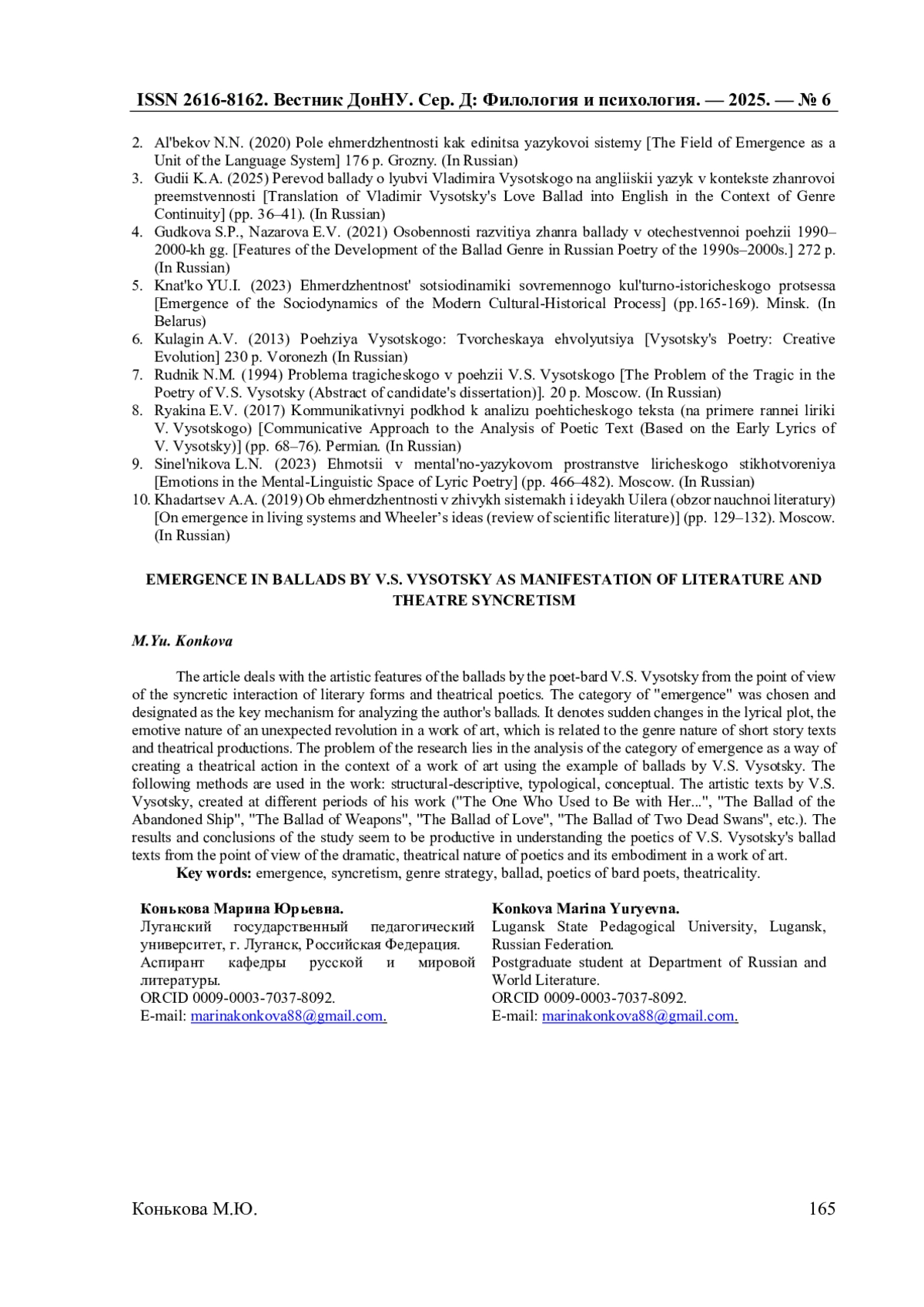 3. Гудий К.А. Перевод баллады о любви Владимира Высоцкого на английский язык в контексте жанровой преемственности / К.А. Гудий, О.А. Егорова // Филологический вестник. - 2025. - Т. 4, № 3. - С. 36- 41.
