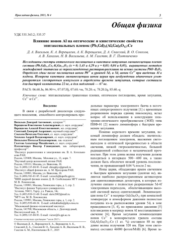Васильев Д. А., Верещагин К. А., Верещагин А. К., Спасский Д. А., Соколов В. О., Хахалин А. В., Васильева Н. В., Галстян А. М., Плотниченко В. Г. Влияние ионов Al на оптические и кинетические свойства эпитаксиальных пленок (Pb, Gd)3(Al, Ga)5O12: Ce 5
