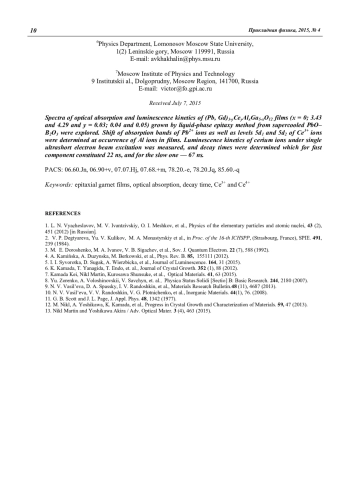 D. А. Vasil’ev, К. А. Vereshchagin, А. К. Vereshchagin, D. А. Spassky, V. O. Sokolov, A. V. Khakhalin, N. V. Vasil’eva, A. M. Galstyan, and V. G. Plotnichenko Influence of Al ions on optical and kinetic properties of (Pb, Gd)3(Al, Ga)5O12: Ce epitaxial films 5