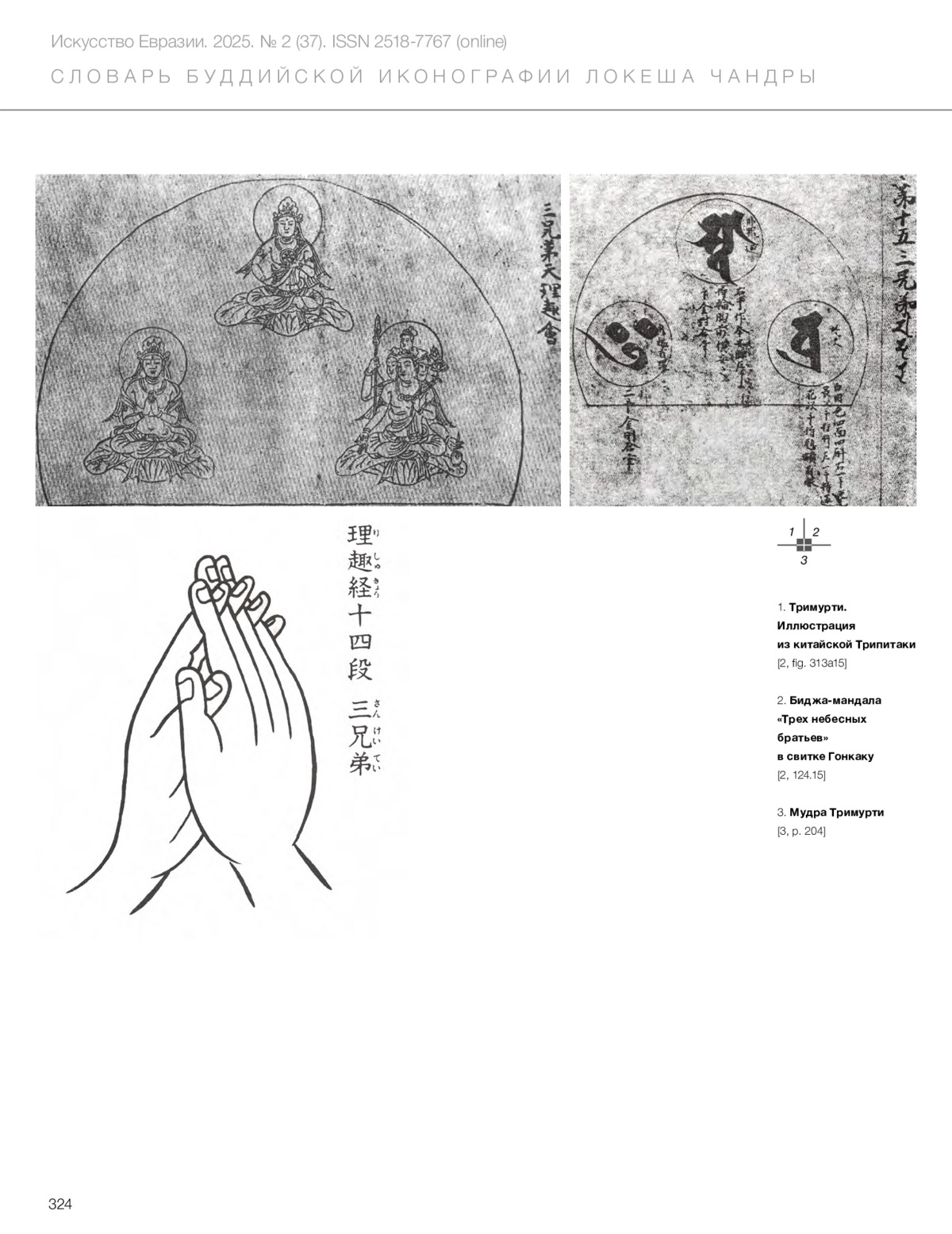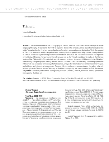 This article focuses on the iconography of Trimurti, which is one of the central concepts in Indian religious philosophy. It represents the trinity of supreme deities who embody various aspects of a single divine origin. Trimurti unites the three key cosmic functions of creation, preservation, and destruction. While the concept of Trimurti is now more widely recognised as a philosophical category than a religious one, the symbolism of Trimurti continues to play an important role in Hinduism and visual art. The article examines the depiction of the triunity of Brahma, Narayana and Maheshvara, as well as the Trimurti mandala and mudra, in the Chinese version of the Tripitaka (5th-6th centuries), which is prevalent in Japan, Vietnam and China, and in the ‘Rishukyo’ translated by Amoghavajra (8th century) and the scroll of Gonkaku (11th-12th centuries). The findings presented in this article can be applied to the study of artistic canons, analyse the historical context and symbolism of images, and attribute and interpret art monuments. The scientific translation and commentary on the article, originally written by Lokesh Chandra for the Dictionary of Buddhist Iconography, has been provided by S. M. Belokurova.