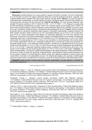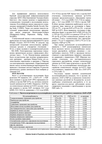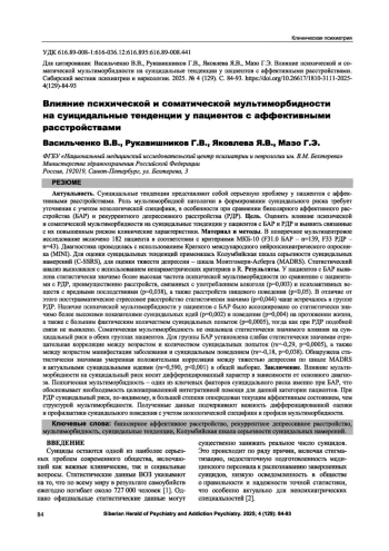 Суицидальные тенденции представляют собой серьезную проблему у пациентов с аффективными расстройствами. Роль мультиморбидной патологии в формировании суицидального риска требует уточнения с учетом нозологической специфики, в особенности при сравнении биполярного аффективного расстройства (БАР) и рекуррентного депрессивного расстройства (РДР). Цель. Оценить влияние психической и соматической мультиморбидности на суицидальные тенденции у пациентов с БАР и РДР и выявить связанные с их повышенным риском клинические характеристики. Материал и методы. В поперечное мультицентровое исследование включено 182 пациента в соответствии с критериями МКБ-10 (F31.0 БАР - n=139, F33 РДР - п=43). Диагностика проводилась с использованием Краткого международного нейропсихиатрического опросника (MINI). Для оценки суицидальных тенденций применялась Колумбийская шкала серьезности суицидальных намерений (C-SSRS), для оценки тяжести депрессии - шкала Монтгомери-Асберга (MADRS). Статистический анализ выполнялся с использованием непараметрических критериев в R. Результаты. У пациентов с БАР выявлена статистически значимо более высокая частота психической мультиморбидности по сравнению с пациентами с РДР, преимущественно расстройств, связанных с употреблением алкоголя (р=0,003) и психоактивных веществ с вредными последствиями (р=0,038), а также расстройств пищевого поведения (р<0,05). В отличие от этого посттравматическое стрессовое расстройство статистически значимо (р=0,044) чаще встречалось в группе РДР. Наличие психической мультиморбидности у пациентов с БАР было ассоциировано со статистически значимо более высокими показателями суицидальных идей (р=0,002) и поведения (р=0,004) на протяжении жизни, а также с большим фактическим количеством суицидальных попыток (р=0,0005), тогда как при РДР подобной связи не выявлено. Соматическая мультиморбидность не оказывала статистически значимого влияния на суицидальный риск в обеих группах пациентов. Для группы БАР установлена слабая статистически значимая отрицательная корреляция между возрастом и количеством суицидальных попыток (rs=-0,29, р=0,0005), а также между возрастом манифестации заболевания и суицидальным поведением (rs=-0,18, р=0,038). Обнаружена статистически значимая умеренная положительная корреляция между тяжестью депрессии по шкале MADRS и актуальными суицидальными идеями (rs=0,590, р<0,001) в общей выборке. Заключение. Влияние мультиморбидности на суицидальный риск носит дифференцированный характер в зависимости от основного диагноза. Психическая мультиморбидность - один из ключевых факторов суицидального риска именно при БАР, что обосновывает необходимость целенаправленной интегративной помощи для данной категории пациентов. При РДР суицидальный риск, по-видимому, в большей степени опосредован текущим аффективным состоянием, чем структурой мультиморбидности. Полученные данные подчеркивают важность дифференцированной оценки и профилактики суицидального поведения с учетом нозологической специфики и профиля мультиморбидности.