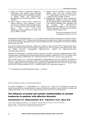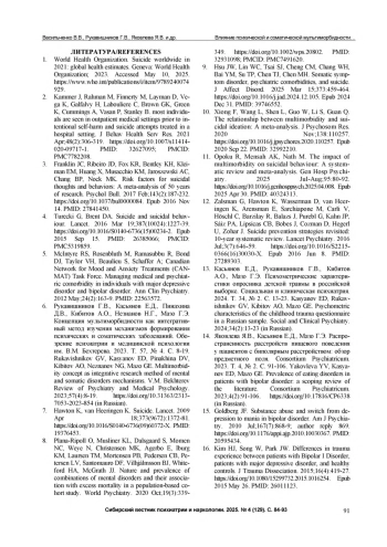 6. Рукавишников Г.В., Касьянов Е.Д., Пинахина Д.В., Кибитов А.О., Незнанов Н.Г., Мазо Г.Э. Концепция мультиморбидности как интегративный метод изучения механизмов формирования психических и соматических заболеваний. Обозрение психиатрии и медицинской психологии им. В.М. Бехтерева. 2023. Т. 57, № 4. С. 8-19.