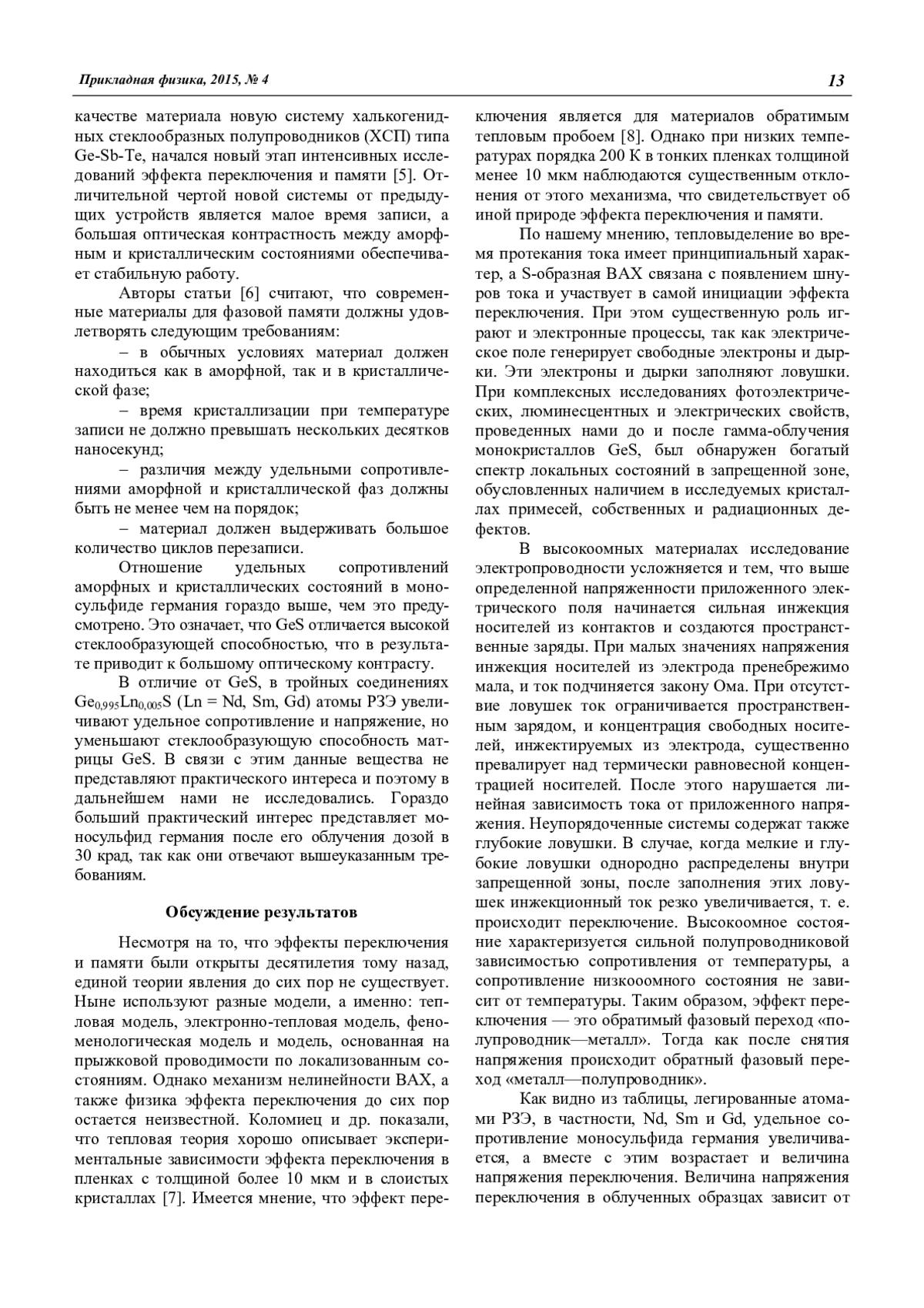 Слоистый полупроводниковый моносульфид германия является перспективным материалом для оптической и электрической записи информации в электрических переключателях и запоминающих устройствах. После проведенных исследований установлено, что легирующие атомы РЗЭ повышают напряжение переключения и затрудняют процесс перехода «полупроводникметалл». Малые дозы гамма-облучения, наоборот, значительно снижает напряжение переключения и время записи, что имеет больший практический интерес.