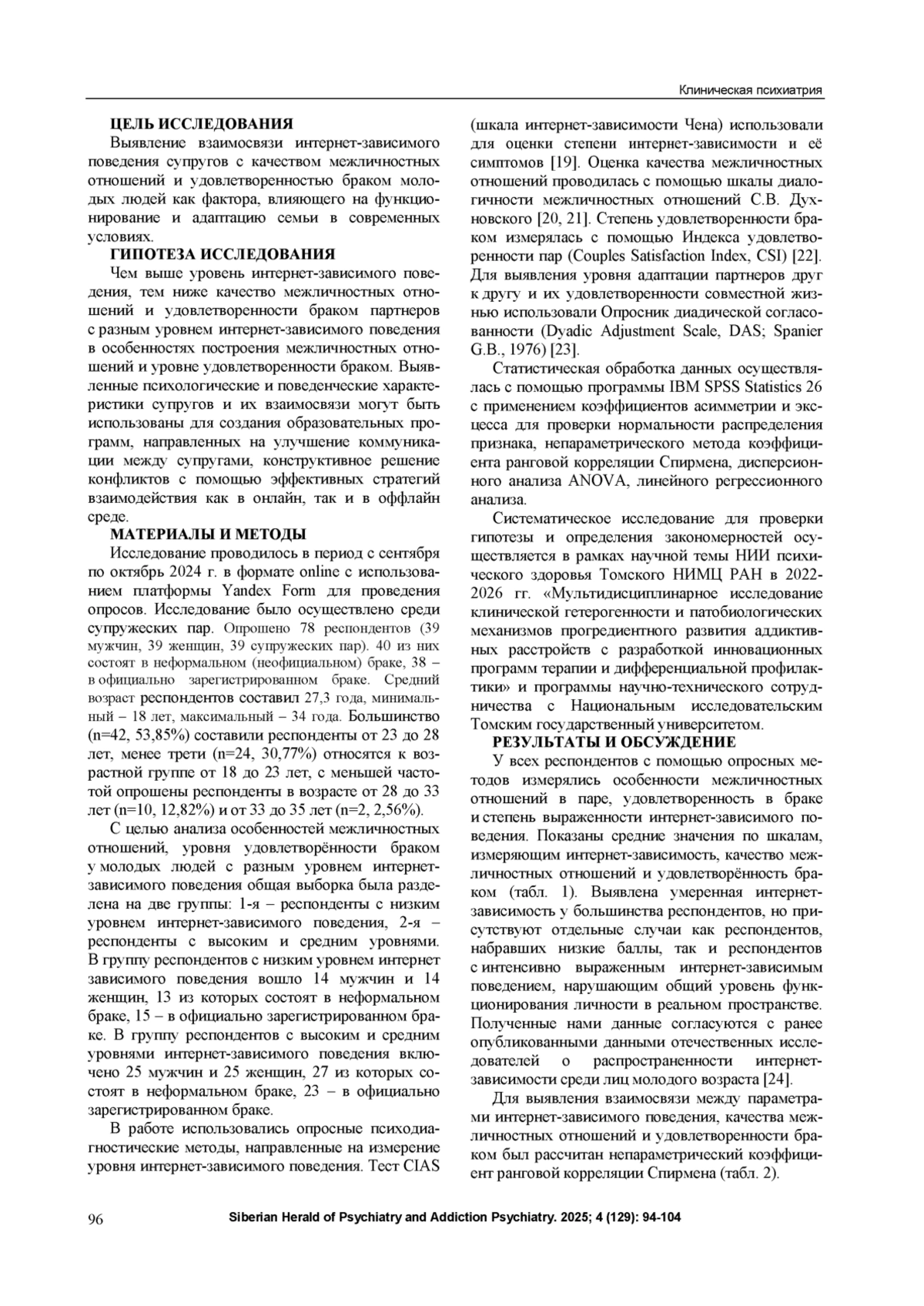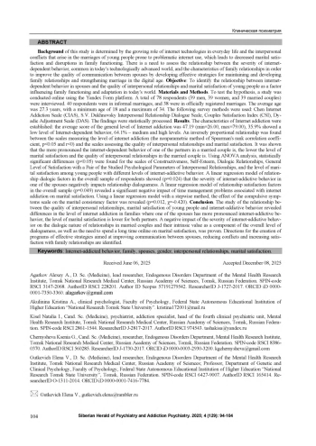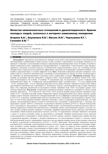 Актуальность определяется растущей ролью интернет-технологий в повседневной жизни и межличностными противоречиями, возникающими в браке молодых людей, склонных к проблемному пользованию интернетом, что приводит к снижению удовлетворенности браком и нарушениям функционирования семьи. Возникает потребность оценки взаимосвязи между выраженностью распространенного в современном технологическом мире интернетзависимого поведения отдельной личности и особенностями взаимоотношений в семье для улучшения качества общения между супругами путем разработки эффективных стратегий для поддержания и развития семейных отношений и укрепления брака в условиях цифровой эпохи. Цель. Выявление взаимосвязи интернет-зависимого поведения супругов с качеством межличностных отношений и удовлетворенностью браком молодых людей как фактора, влияющего на функционирование и адаптацию семьи в современных условиях. Материалы и методы. Исследование для проверки гипотезы проводилось в формате online с использованием платформы Yandex Form. Опрошено 78 респондентов (39 мужчин, 39 женщин, 39 супружеских пар). 40 респондентов состоят в неформальном (неофициальном) браке, 38 - в официально зарегистрированном браке. Средний возраст - 27,3 года, минимальный - 18 лет, максимальный - 34 года. Применяли опросные методы: Шкала интернет-зависимости Чена (CIAS), Шкала диалогичности межличностных отношений С. В. Духновского, Индекс удовлетворенности пар (Couples Satisfaction Index, CSI), Опросник диадической согласованности (Dyadic Adjustment Scale, DAS). Полученные данные статистически обработаны. Результаты. Установлены особенности интернет-зависимости: средний балл общего уровня интернет-зависимости - 47,19 (min=26,00, max=79,00), 35,9% показали низкий уровень интернет-зависимого поведения, 64,1% - средний и высокий уровни. Обнаружена обратно пропорциональная связь между шкалами, измеряющими уровень интернет-зависимости (непараметрический метод коэффициента ранговой корреляции Спирмена, p<0,05 и г<0), и шкалами, оценивающими качество межличностных отношений и удовлетворённость браком. Показано, что чем больше выражено интернет-зависимое поведение у одного из партнеров супружеской пары, тем ниже уровень удовлетворённости браком и качество межличностных отношений в супружеской паре. С помощью дисперсионного анализа ANOVA установлены статистически значимые различия (p<0,05) по шкалам Конструктивность, Самоценность, Диалогичность отношений, Общий уровень удовлетворенности парой исследуемых психологических параметров особенностей межличностных отношений, уровня удовлетворённости браком у молодых людей с разным уровнем интернет-зависимого поведения. Линейная регрессионная модель факторов диалогичности отношений в общей выборке респондентов показала (p=0,024), что выраженность интернет-зависимого поведения у одного из супругов негативно влияет на диалогичность отношений. Линейная регрессионная модель факторов удовлетворенности отношениями в общей выборке (p=0,049) выявила значимое отрицательное влияние проблем с управлением временем, связанных с интернет-зависимостью, на удовлетворенность браком. С помощью линейной регрессионной модели с применением пошагового метода выявили влияние шкалы компульсивных симптомов на фактор супружеской согласованности (p=0,012, x=-0,420). Заключение. Исследование взаимосвязи качес