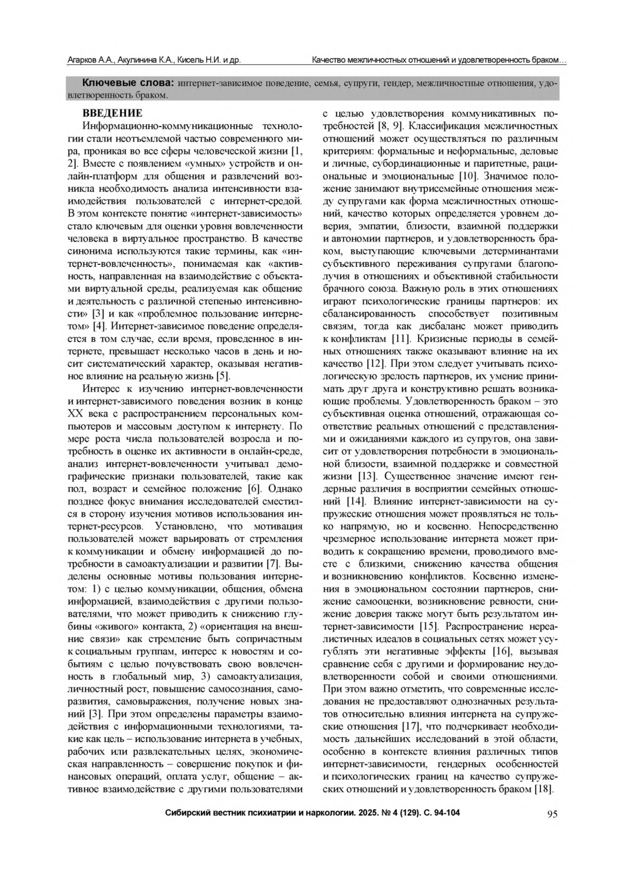 6. Кочетков Н.В., Кудряшов Д.П. Вовлеченность в киберсоциализацию молодежи и ее социально-демографические характеристики как предикторы невоплощенности в интернете. Социальная психология и общество. 2024. Т. 15, № 2. С. 65-81.