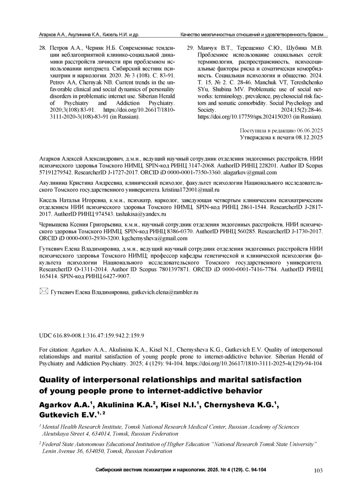 29. Манчук В.Т., Терещенко С.Ю., Шубина М.В. Проблемное использование социальных сетей: терминология, распространенность, психосоциальные факторы риска и соматическая коморбидность. Социальная психология и общество. 2024. Т. 15, № 2. С. 28-46.