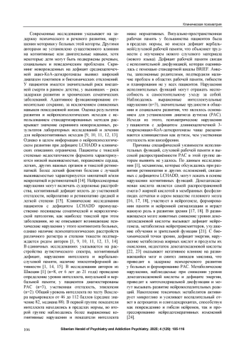 Независимо от тяжести COVID-19 и продолжительности постковидного периода сохраняются жалобы пациентов на когнитивную дисфункцию, возникновение которой совпало по времени с активной фазой перенесенной инфекции. Цель. Изучение факторов риска развития когнитивной дисфункции и особенностей когнитивных нарушений у пациентов, перенесших инфекцию COVID-19. Материалы и методы. На базе первого клинического психиатрического отделения клиники НИИ психического здоровья Томского НИМЦ проведено комплексное обследование 48 пациентов (8 мужчин и 40 женщин) с непсихотическими психическими расстройствами в виде когнитивной дисфункции, астенических расстройств, диагностированных в постковидный период. Использовались методы: клинико-психопатологический, физикальный, психологический, клинико-лабораторный, инструментальный, статистический. Для определения когнитивного ресурса применялись тесты: Таблицы Шульте, Методика заучивания 10 слов по А. Р. Лурия. Ситуативную тревожность оценивали с помощью Методики оценки ситуативной тревоги Спилбергера-Ханина. Результаты. Особенностью психодиагностического обследования пациентов было наличие более двух сопутствующих заболеваний внутренних органов и других патологических состояний - полиморбидность, являющаяся неблагоприятным фоном для преодоления вирусной инфекции. У 68,75% пациентов COVID-19 протекал в легкой форме, но остаточно сохранялась фиксация на снижении когнитивного функционирования. Независимо от степени тяжести COVID-19 пациенты значимо не отличались по возрасту, показателю полиморбидности, уровню ситуативной тревожности, результатам выполненных методик по оценке когнитивных функций (внимания, памяти). На момент обследования пациенты затруднялись длительно концентрировать внимание на смысле задания, могли удерживать в памяти ограниченный цифровой ряд, не замечая и не исправляя ошибки. Были проанализированы эффективность работы, степень врабатываемости и психическая устойчивость; «кривая истощаемости» и «кривая запоминания; взаимосвязи показателей когнитивного функционирования и ситуативной тревожности. Наиболее низкий когнитивный ресурс отмечен в группе мужчин, страдающих нарушением ритма сердца, имеющих хроническую обструктивную болезнь легких. Женщины с гипотиреозом обнаруживали хорошую врабатываемость, но сниженную устойчивость к нагрузкам в процессе выполнения заданий. Выявлены прямые корреляционные связи между показателем ситуативной тревожности после лечения и временем выполнения задания при работе с таблицами Шульте (R=0,310, p=0,031875 - таблица 3; R=0,350, p=0,014573 - таблица 5). Заключение. Анализ факторов риска развития когнитивных нарушений показал, что при наличии высоких показателей полиморбидности отдельные состояния и заболевания обусловливают статистически значимые различия по сравнению с их отсутствием, оказывая влияние на психическое здоровье и работоспособность пациентов с церебральными расстройствами, обнаруживающих когнитивную дисфункцию. Многообразие и неоднозначность выявленных взаимосвязей требуют дифференцированного подхода к диагностике и терапевтической тактике при курации пациентов с жалобами на когнитивную дисфункцию в структуре органических непсихотических расстройств с полиморбидной соматической патологией.