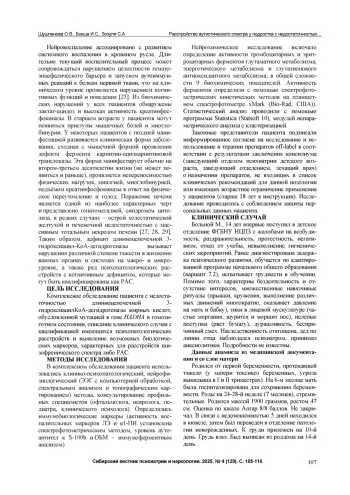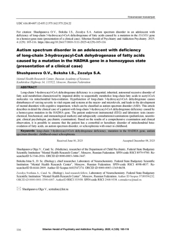 Дефицит длинноцепочечной 3-гидроксиацил-КоА-дегидрогеназы - это врожденное наследственное аутосомнорецессивное заболевание с нарушением метаболизма жирных кислот, характеризующееся ухудшением способности последовательно метаболизировать длинноцепочечные жирные кислоты до ацетил-КоА-молекул путем митохондриального бета-окисления. Гипофункция длинноцепочечной 3-гидроксиацил-КоА-дегидрогеназы вызывает нарушения различной степени тяжести в жизненно важных органах и системах на макро- и микроуровне, а также приводит к развитию психических расстройств с когнитивной недостаточностью, которые могут быть квалифицированы как расстройство аутистического спектра (РАС). В данной статье подробно рассмотрен клинический случай пациента с недостаточностью длинноцепочечной 3-гидроксиацил-КоА-дегидрогеназы жирных кислот, обусловленной мутацией в гене НАDНА в гомозиготном состоянии. Пациенту были проведены инструментальные (ЭЭГ) и лабораторные исследования (нейрохимические, биохимические и иммунологические маркеры) и консультирование/ осмотр узких специалистов (педиатр, невролог, клинический психолог, психиатрическое обследование). По результатам комплексного обследования и клинического наблюдения возможно предположить наличие у больного коморбидного либо обусловленного наследственным нарушением митохондриального бета-окисления жирных кислот расстройства аутистического спектра или шизофрении с началом в детском возрасте.