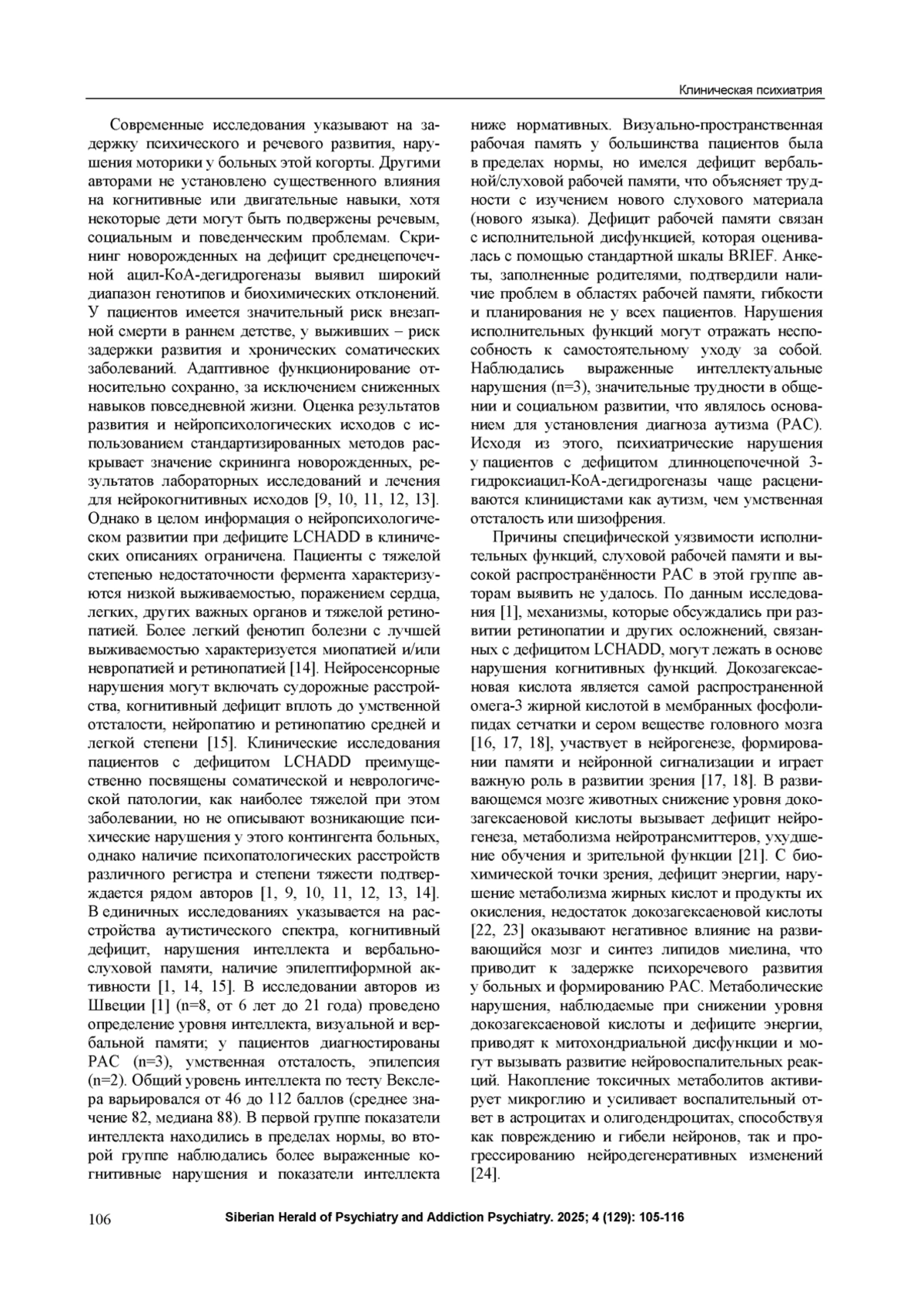Дефицит длинноцепочечной 3-гидроксиацилКоА-дегидрогеназы (LCHADD) является врожденным наследственным аутосомно-рецессивным заболеванием, характеризующимся нарушением метаболизма жирных кислот и способности последовательно метаболизировать длинноцепочечные жирные кислоты до ацетил-КоА-молекул путем митохондриального бета-окисления. Показано, что пациенты с дефицитом LCHADD имеют специфический когнитивный паттерн в виде интеллектуальной недостаточности и специфических аутистических нарушений или нормального уровня IQ с низкими показателями слуховой вербальной памяти, адаптивных и исполнительных функций. Кроме того, у них чаще, чем в нормальной популяции, встречается избыточный вес/ожирение. Корреляции между генотипом и фенотипом указывают на связь между гомозиготностью и более тяжелым поражением сердца у пациентов с LCHADD [1, 2, 3, 4].