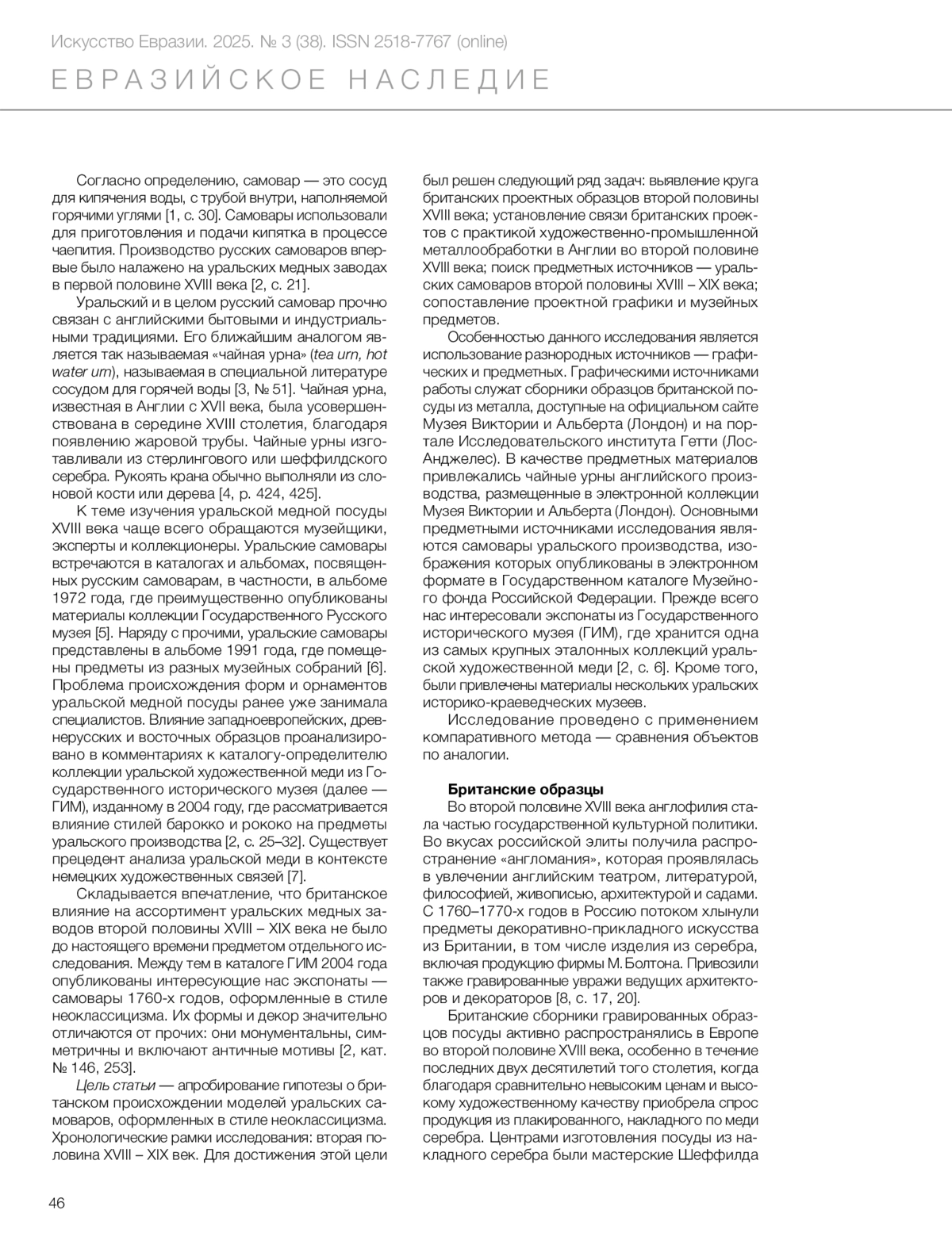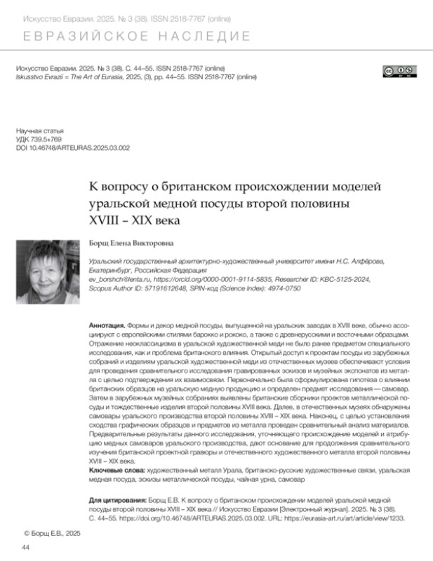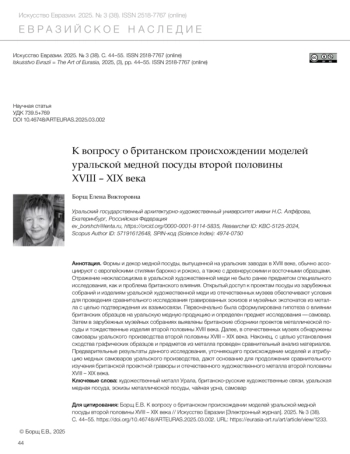 Борщ Е.В. К вопросу о британском происхождении моделей уральской медной посуды второй половины XVIII – XIX века // Искусство Евразии [Электронный журнал]. 2025. No 3 (38).