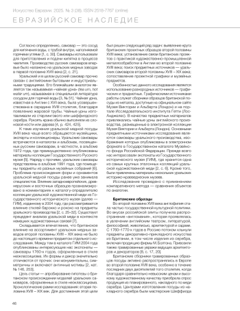 The shapes and decor of copper tableware from the Ural factories of the 18th century are usually associated with the European Baroque and Rococo styles, as well as Old Russian and Eastern models. The reflection of neoclassicism in Ural artistic copper has not previously been the subject of a special study, nor has the problem of British influence. Open access to designs for tableware from foreign collections and items of Ural artistic copper from domestic museums provides conditions for a comparative study of engraved sketches and museum items made of metal in order to confirm their relationship. Initially, a hypothesis was formulated about the influence of British samples on Ural copper products, and the source of the study was determined - a samovar. Then, British collections of metal tableware designs and identical items from the second half of the 18th century were found in foreign museum collections. Next, samovars of Ural production from the second half of the 18th - 19th centuries were found in domestic museums. Finally, a comparative analysis of the materials was carried out in order to establish the similarity of graphic samples and metal objects. The preliminary results of this study, which clarifies the origin of the models and attribution of copper samovars of Ural production, provide grounds for continuing the comparative study of British design engraving and domestic artistic metalwork of the second half of the 18th - 19th centuries.