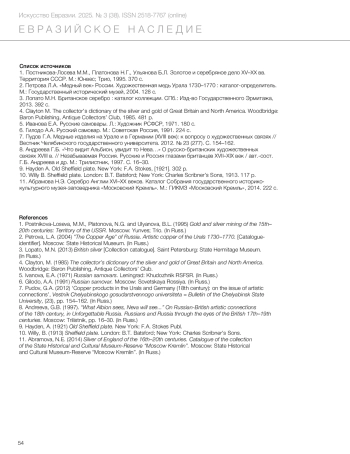 2. Petrova, L.A. (2004) *“The Copper Age” of Russia. Artistic copper of the Urals 1730–1770* [Catalogue‑identifier]. Moscow: State Historical Museum. (In Russ.)