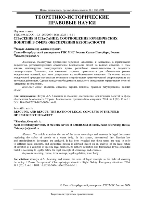 Справедливо подчеркивается, что обеспечение защищенности «в разных сферах деятельности человека, общества и государства должно базироваться не только на эмпирическом опыте, но и, что немаловажно, на надежной теоретической основе» [1]. Обоснованный в юридической науке системный подход к регламентации деятельности в сфере безопасности [2] предполагает эффективное использование всех, в том числе юридических средств. Защита от угроз в рассматриваемой сфере нередко связана с ограничением прав и свобод, предусматривает юридические обязанности различных субъектов, поэтому не может быть обеспечена вне права. В этом смысле значительным эвристическим потенциалом в обозначенной предметной области обладает методологический подход, основанный на анализе используемого в законодательстве понятийно-категориального аппарата. Выработка легальных определений для регламентации отношений спасания людей на воде должна составить основу законодательства в этой области. В связи с этим необходимо отметить, что анализ нормативного правового регулирования отношений, связанных со спасанием людей на воде, позволяет констатировать отсутствие обоснованных наукой и практикой дефиниций понятий «спасание» и «спасение», следствием чего употребление соответствующих терминов нередко противоречит содержанию понятий. Указанное актуализирует научные исследования в этом направлении.