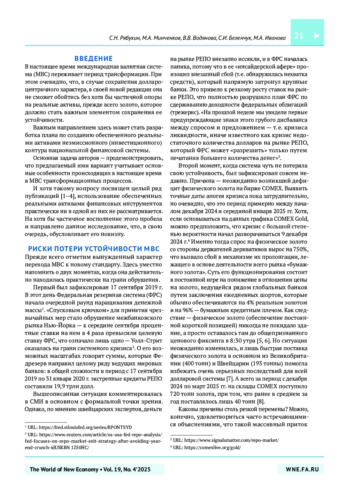 Актуальность. Направленность трансформационных процессов в международной валютной системе дает основание предполагать, что реальные активы смогут сыграть довольно заметную роль в обеспечении ее устойчивости. Цель исследования — доказать, что одним из механизмов поддержания устойчивости новой редакции международной валютной системы, сохраняющей доллароцентричный характер, может стать использование финансовых инструментов, обеспеченных реальными активами: прежде всего золота и, вероятно, других минеральных ресурсов. Для выявления будущих тенденций в статье специально рассматриваются моменты, когда международная валютная система реально находилась на грани если не обрушения, то, по крайней мере, мгновенной потери своей устойчивости. Для России учет этого аспекта является необходимостью, так как перед ней стоит задача формирования действительно суверенной национальной финансово-денежной системы. В данном контексте рассматривается последовательность шагов для создания неэмиссионного (резервного) контура национальной финансовой системы и финансовых инструментов его обращения.