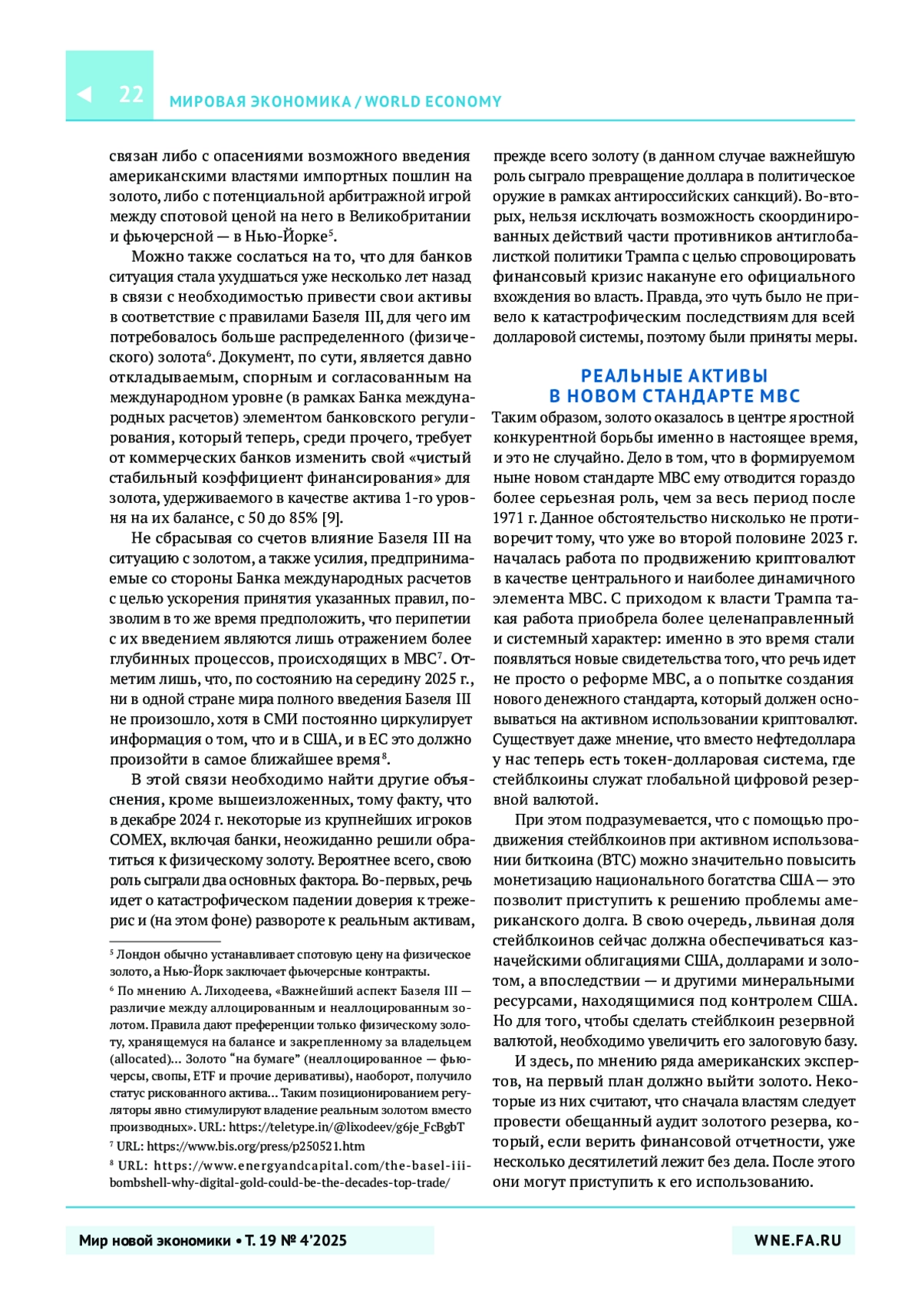 8. Piepenburg M. Basel III and gold: The trillion-dollar question. Von Greyerz AG. URL: https://vongreyerz.gold/gold-basel-iii-trillion-dollar-question 10. Hicks B. The gold crunch of 2025: Why you may never hold a gold coin again (unless you act fast). Wealth Daily. URL: https://golnk.ru/OenD6