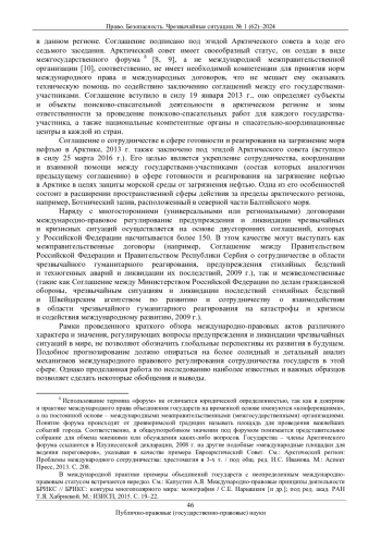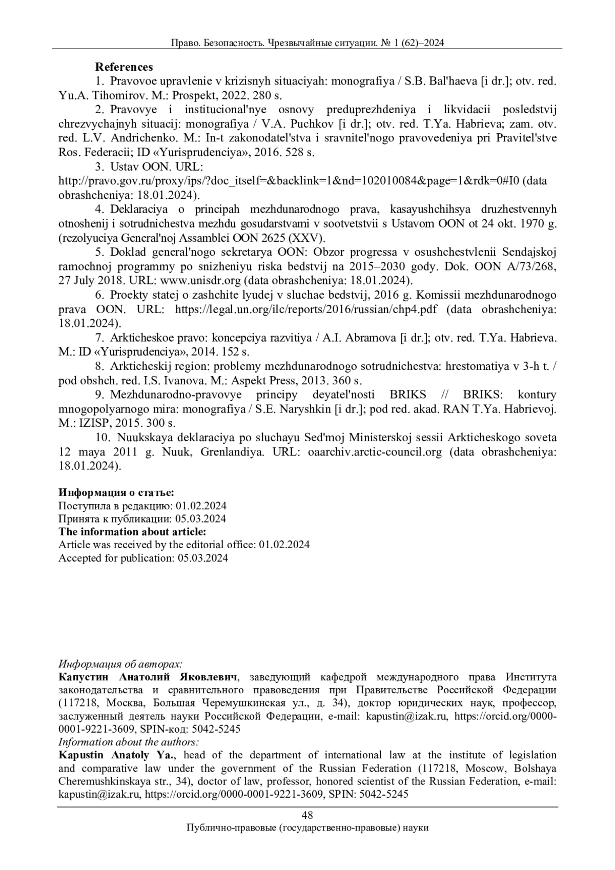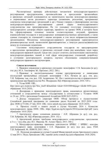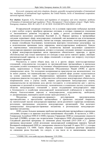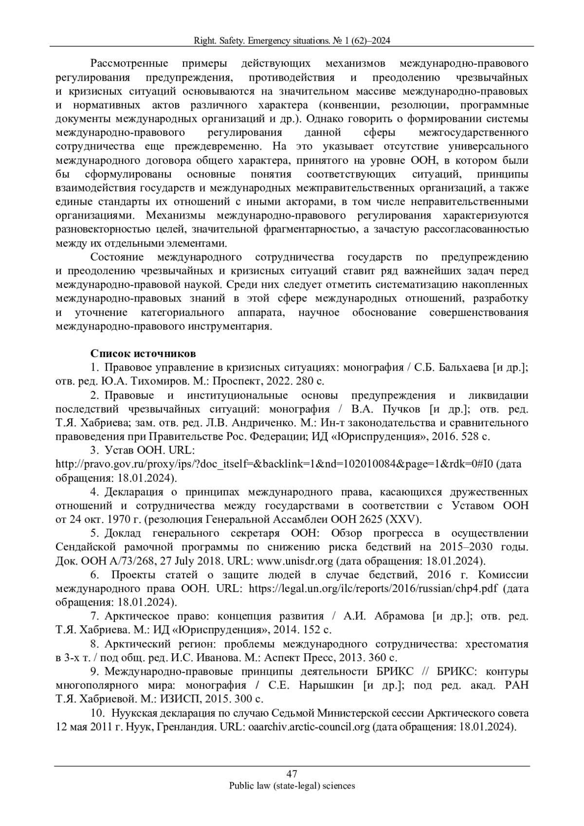 В юридической литературе отмечается, что в условиях нарастания глобальных вызовов и угроз особую остроту приобрели кризисные ситуации, в которых отражаются отклонения от эволюционного развития государства и права, с ростом достижений цивилизации наблюдается неуклонное увеличение бедствий [1, 2]. Нередко кризисы и чрезвычайные ситуации затрагивают сферу международных отношений, они вызываются как естественными причинами (погодными аномалиями, такими как пожары, наводнения, землетрясения, ураганы, и иными стихийными бедствиями), человеческим фактором (техногенные катастрофы), так и политическими причинами (акты терроризма, межгосударственные конфликты). Каждое из перечисленных нежелательных для человечества явлений заслуживает адекватного международно-правового реагирования, которое в отдельных ситуациях начинает складываться в форме международно-правовых актов юридически обязательного характера, в других обстоятельствах еще только намечаются его контуры в виде актов «мягкого права», имеющих рекомендательный характер, но есть сферы отношений, в которых оно попросту отсутствует до настоящего времени.