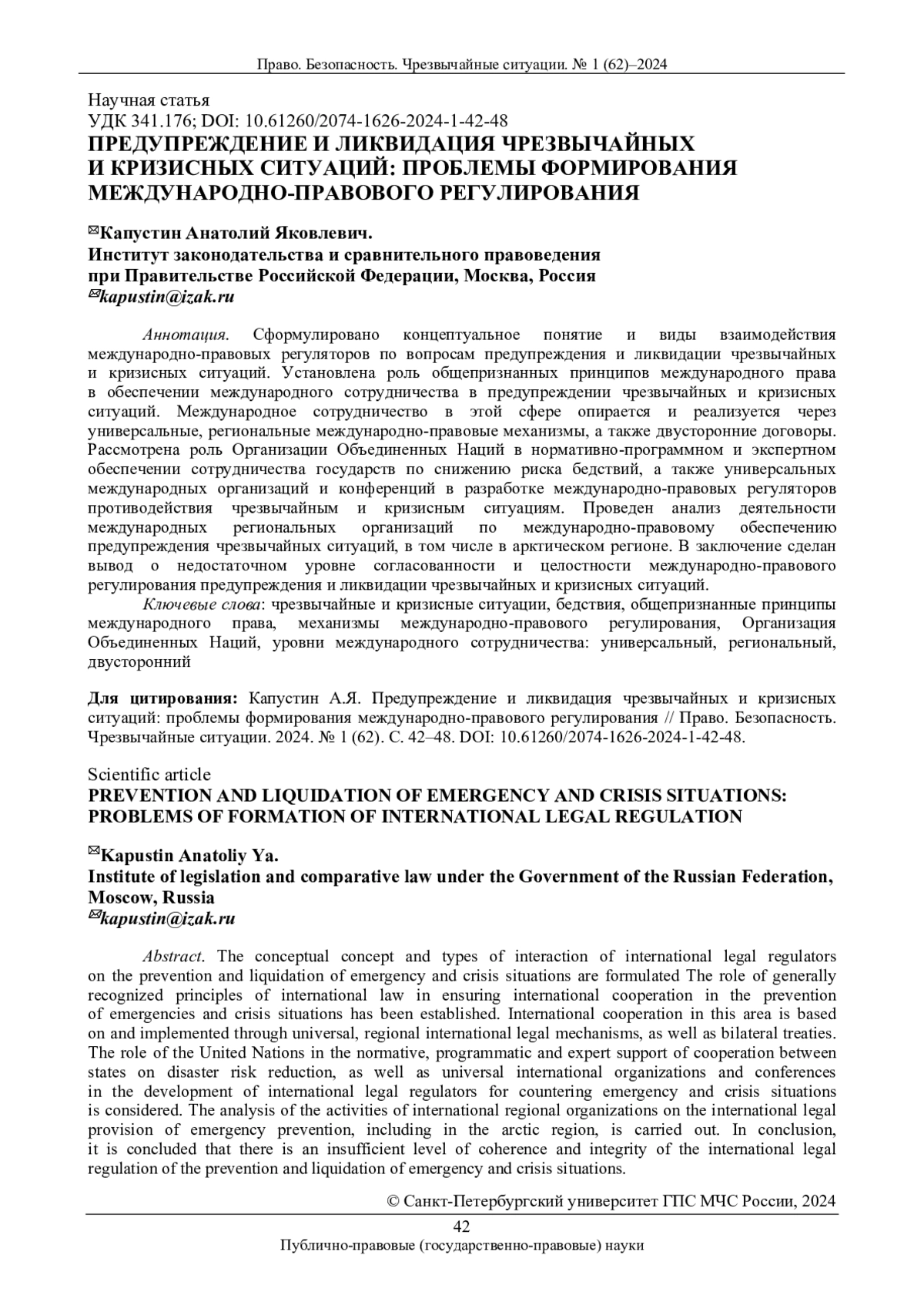 Сформулировано концептуальное понятие и виды взаимодействия международно-правовых регуляторов по вопросам предупреждения и ликвидации чрезвычайных и кризисных ситуаций. Установлена роль общепризнанных принципов международного права в обеспечении международного сотрудничества в предупреждении чрезвычайных и кризисных ситуаций. Международное сотрудничество в этой сфере опирается и реализуется через универсальные, региональные международно-правовые механизмы, а также двусторонние договоры. Рассмотрена роль Организации Объединенных Наций в нормативно-программном и экспертном обеспечении сотрудничества государств по снижению риска бедствий, а также универсальных международных организаций и конференций в разработке международно-правовых регуляторов противодействия чрезвычайным и кризисным ситуациям. Проведен анализ деятельности международных региональных организаций по международно-правовому обеспечению предупреждения чрезвычайных ситуаций, в том числе в арктическом регионе. В заключение сделан вывод о недостаточном уровне согласованности и целостности международно-правового регулирования предупреждения и ликвидации чрезвычайных и кризисных ситуаций.