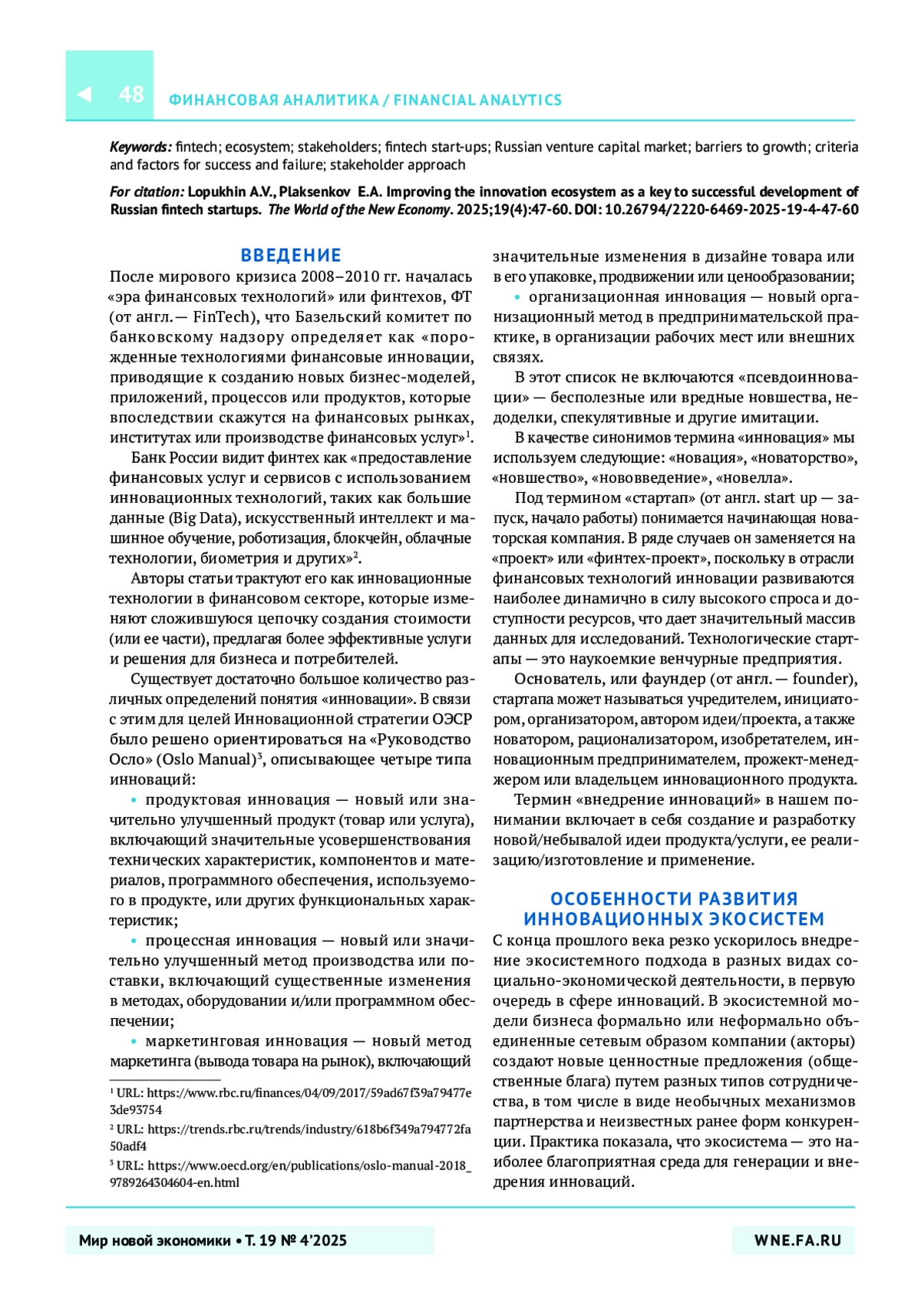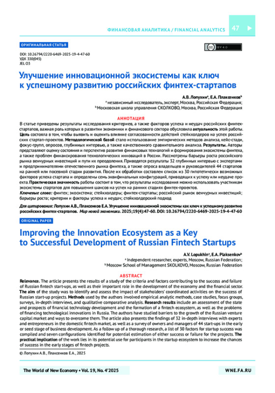 В статье приведены результаты исследования критериев, а также факторов успеха и неудач российских финтехстартапов, важная роль которых в развитии экономики и финансового сектора обусловила актуальность этой работы. Цель состояла в том, чтобы выявить и оценить влияние согласованности действий стейкхолдеров на успех российских стартап-проектов. Методологической базой стало использование эмпирических методов анализа, кейс-стади, фокус-групп, опросов, глубинных интервью, а также качественного сравнительного анализа. результаты. Авторы представляют оценку состояния и перспектив развития финансовых технологий и формирования экосистемы финтеха, а также проблем финансирования технологических инноваций в России. Рассмотрены барьеры роста российского рынка венчурных инвестиций и пути их преодоления. Приводятся результаты 32 глубинных интервью с экспертами и предпринимателями отечественного рынка финтеха, а также опроса владельцев и руководителей 44 стартапов на ранней или посевной стадии развития. После их обработки составлен список из 30 гипотетически возможных факторов успеха стартапа и определены семь эквифинальных конфигураций, приводящих к успеху или неудаче проекта. Практическая значимость работы состоит в том, что результаты исследования можно использовать участникам экосистемы стартапов для повышения шансов на успех на ранних стадиях финтех-проектов.