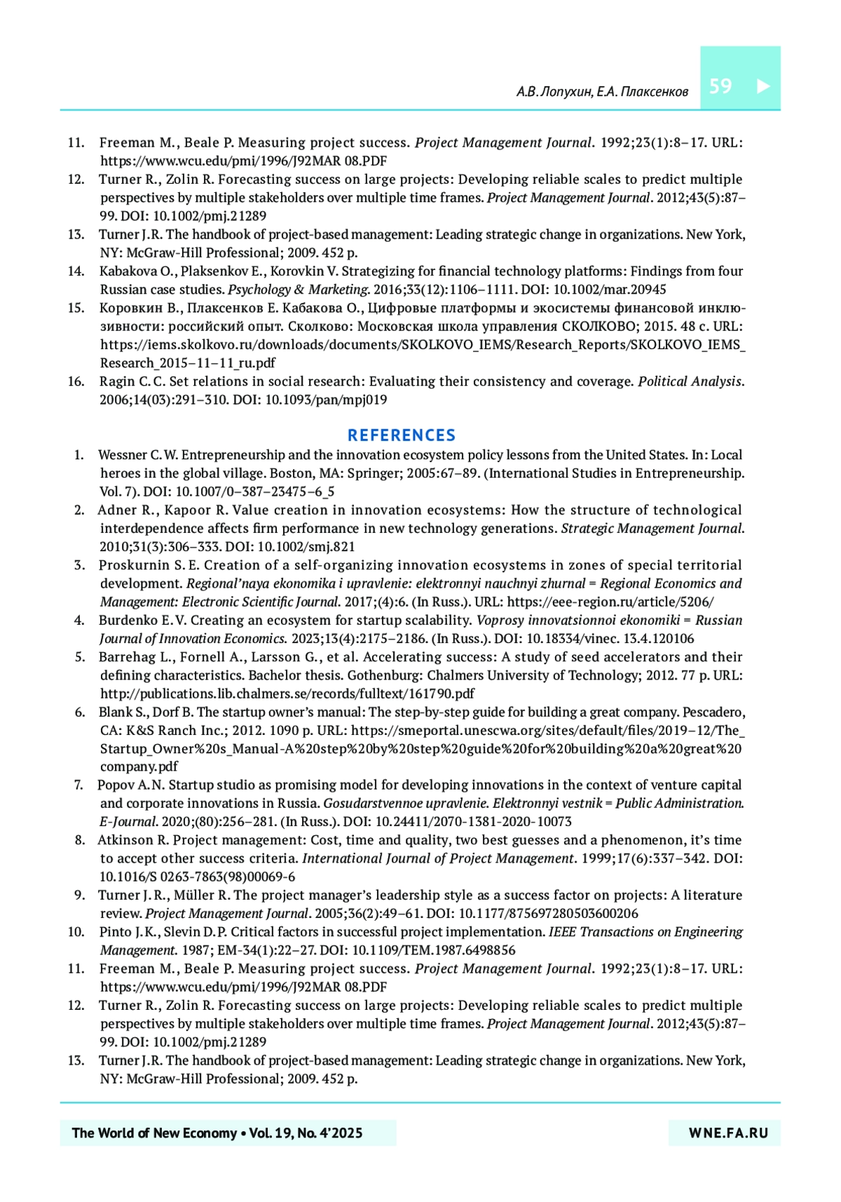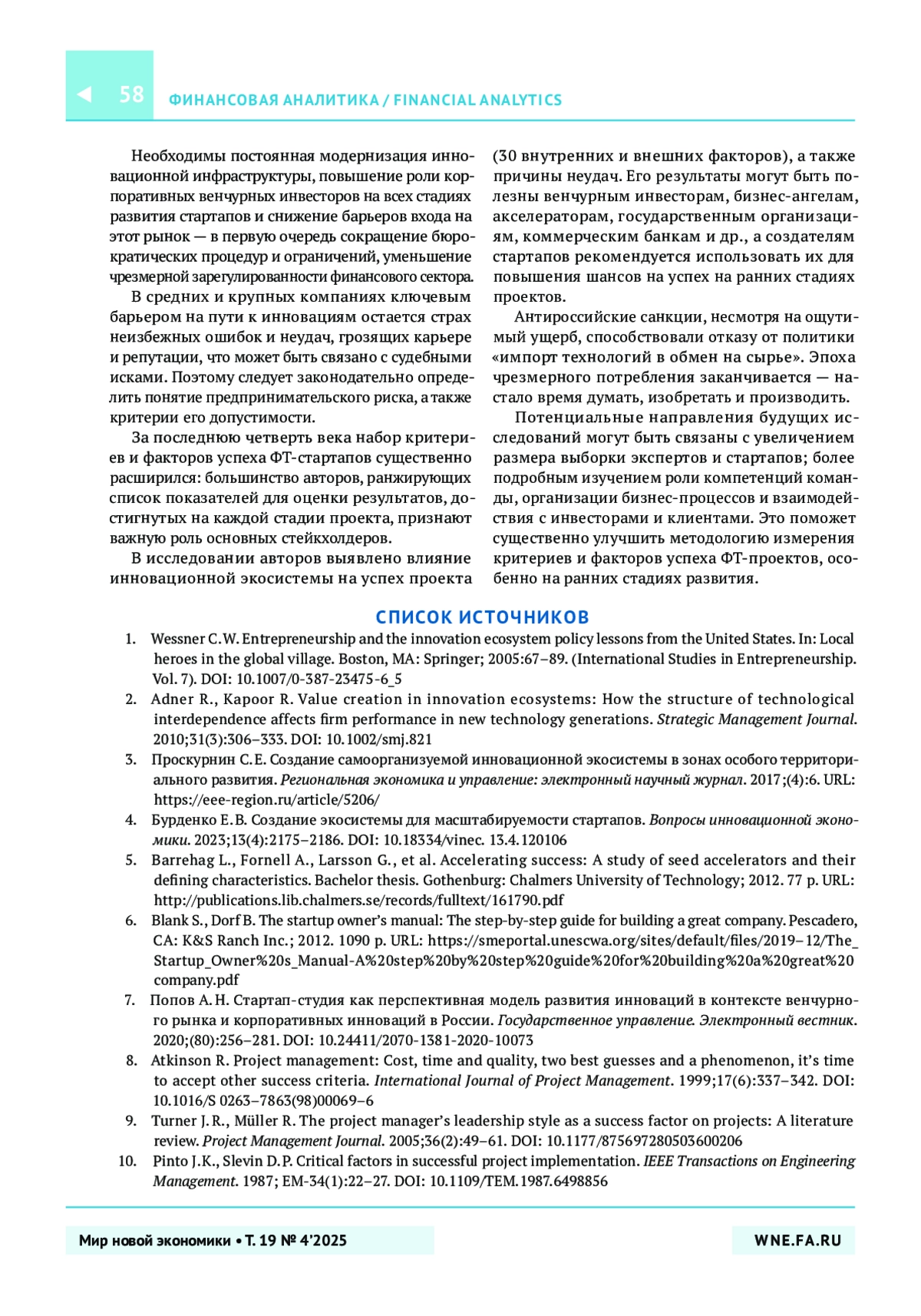 3. Проскурнин С.Е. Создание самоорганизуемой инновационной экосистемы в зонах особого территориального развития. Региональная экономика и управление: электронный научный журнал. 2017;(4):6. URL: https://eee-region.ru/article/5206 4. Бурденко Е.В. Создание экосистемы для масштабируемости стартапов. Вопросы инновационной экономики. 2023;13(4):2175-2186. https://doi.org/10.18334/vinec.13.4.120106