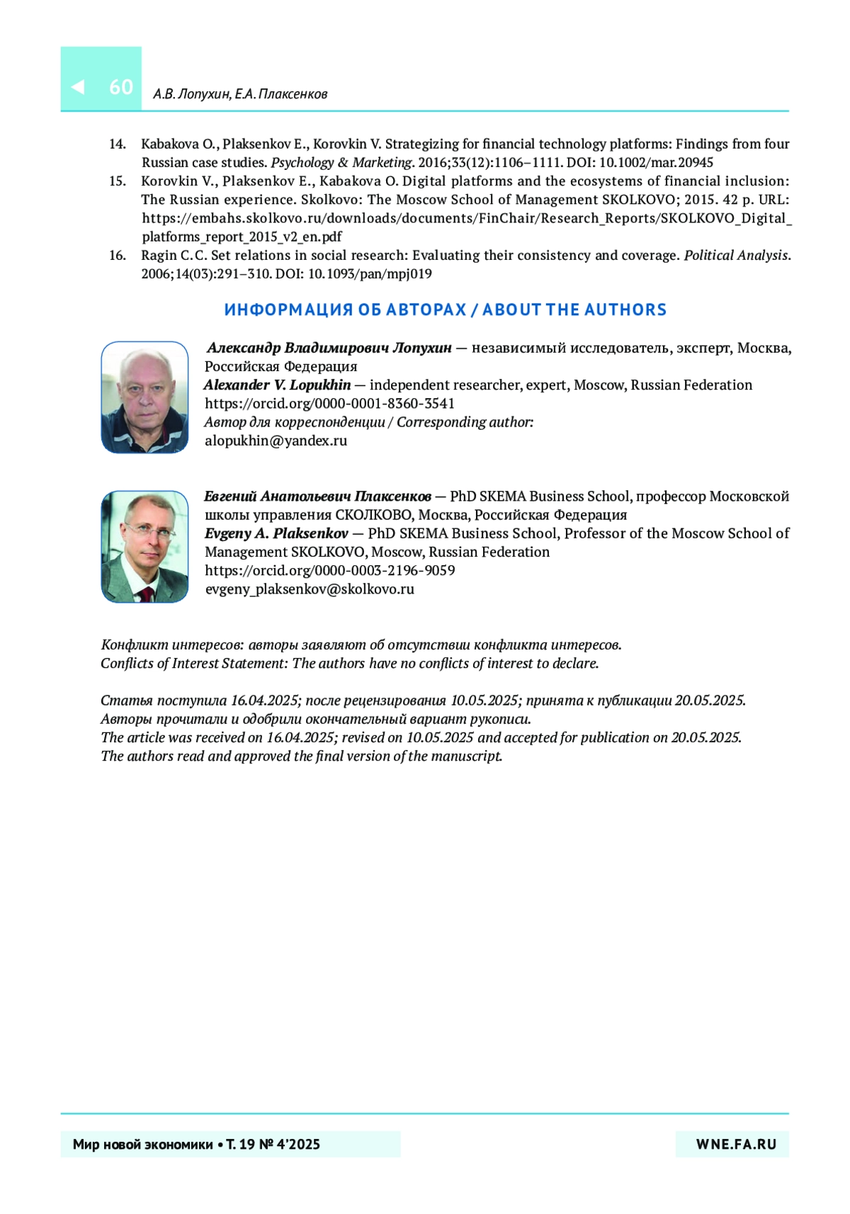 12. Kabakova O., Plaksenkov E., Korovkin V. Strategizing for financial technology platforms: Findings from four Russian case studies. Psychology & Marketing. 2016;33(12):1106-1111. https://doi.org/10.1002/mar.20945