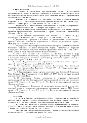 2. Немченко С.Б., Смирнова А.А. Пожарный служащий Российской империи на рубеже XVIII-XIX веков: определение, состав, правовое положение // Науч.-аналит. журн. “Вестник С-Петерб. ун-та ГПС МЧС России”. 2013. № 2. С. 81-85. EDN: QZQBID