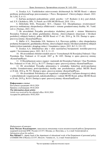 4. Зозуля А.А. Юридическое мировоззрение должностных лиц МЧС России в ракурсе проблемы профессионального правосознания // Право. Безопасность. Чрезвычайные ситуации. 2022. № 3 (56). С. 6-13. EDN: ORZQHC