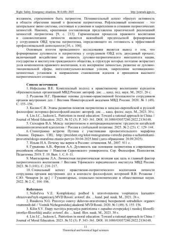 1. Нефедьева В.Е. Комплексный подход к нравственному воспитанию курсантов образовательных организаций МВД России: автореф. дис.... канд. пед. наук. М., 2021. 26 с. EDN: YNPZCG