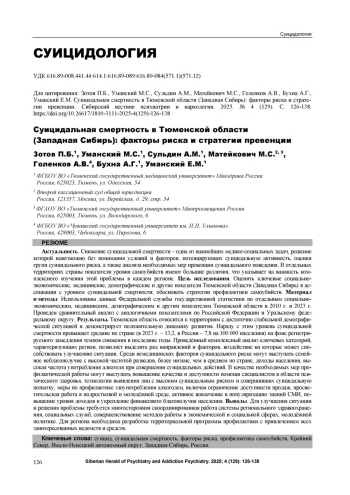 42. Зотов П.Б., Спадерова Н.Н., Рейхерт Л.И., Гарагашева Е.П., Бухна А.Г., Приленский Б.Ю. Суицидальные попытки в Тюмени в 2012-2020 гг.: опыт организации системы выявления и учёта. Российский психиатрический журнал. 2021. № 5. С. 14-20.