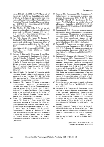 17. Куприянова И.Е., Васильева М.Г., Мальцев В.С., Казенных Т.В. Суицидальное поведение женщин. Суицидология. 2025. Т. 16, № 2 (59). С. 134-146.