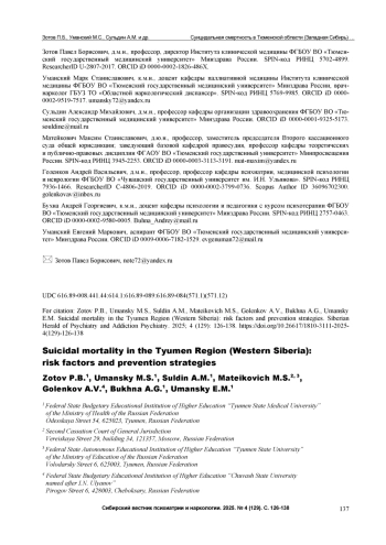 Zotov PB, Spaderova NN, Reichert LI, Garagasheva EP, Bukhna AG, Prilensky BYu. Suicidal attempts in Tyumen in 2012-2020: experience of organizing a system of identification and accounting. Russian Journal of Psychiatry. 2021;5:14-20. Х-2021-10502 (in Russian). DOI: 10.47877/1560-957