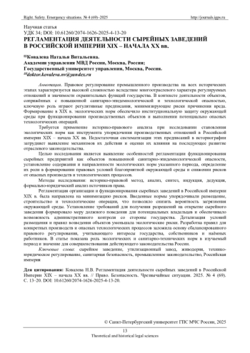 Актуальность исследования определяется необходимостью научного осмысления правовых основ деятельности сырейных заведений как объектов повышенной санитарно-эпидемиологической и технологической опасности в Российской империи XIX – начала XX вв. Регламентация их функционирования отражала формирование государственной системы правового контроля за безопасностью производственной деятельности и охраной здоровья населения, что предопределило развитие последующего законодательства в сфере промышленной и экологической безопасности.