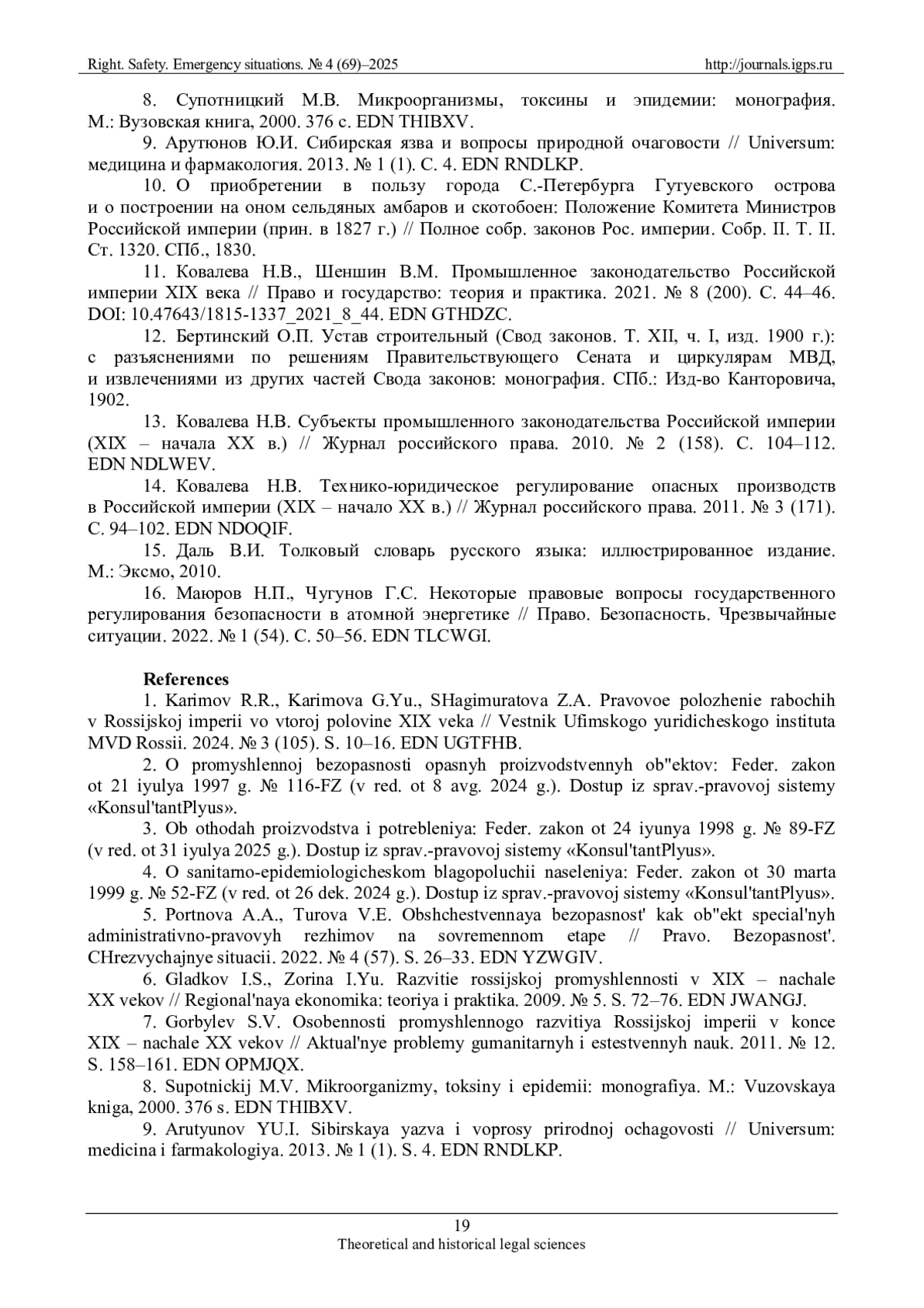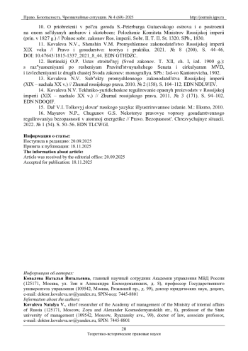 14. Ковалева Н.В. Технико-юридическое регулирование опасных производств в Российской империи (XIX - начало XX в.) // Журнал российского права. 2011. № 3 (171). С. 94-102. EDN: NDOQIF