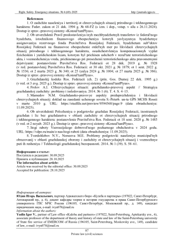 5. Мамедов Н.М. Гражданско-правовые аспекты предупреждения и ликвидации чрезвычайных ситуаций: доклад на заседании ученого совета С.-Петерб. ун-та ГПС МЧС России в марте 2010 г. URL: https://studfile.net/preview/9594568/page:9 (дата обращения: 11.09.2025).