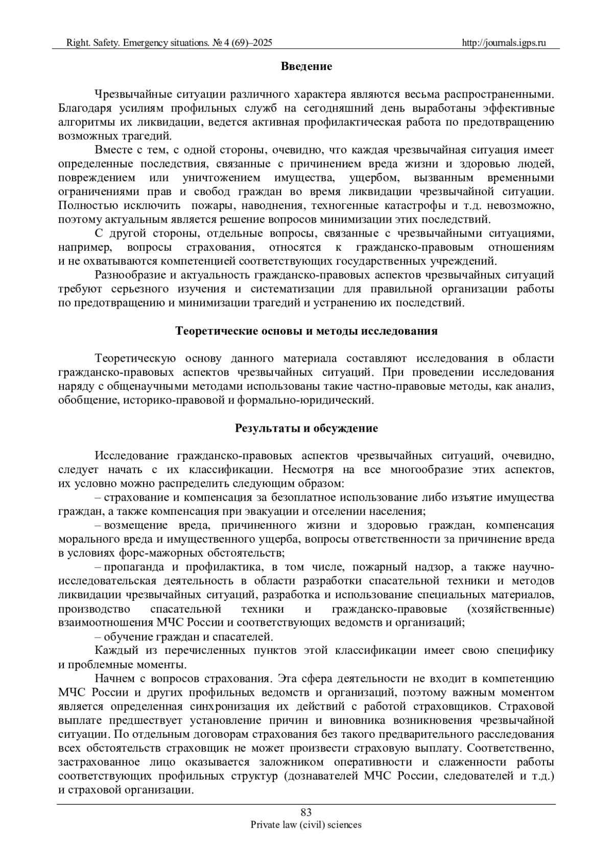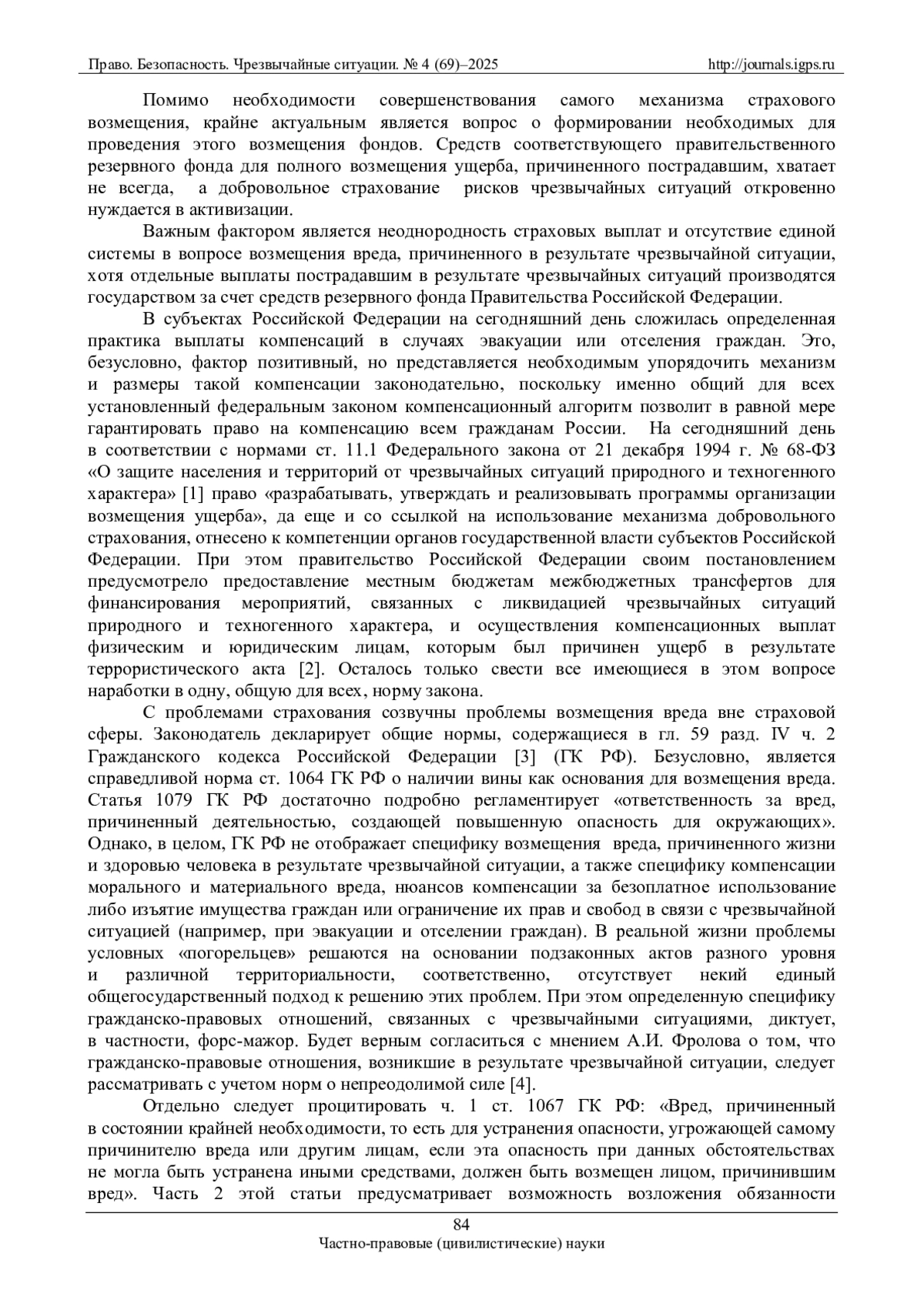 4. Фролов А.И. Чрезвычайные ситуации: гражданско-правовой аспект // Стратегия гражданской защиты: проблемы и исследования. 2014. № 1 (6). Т. 4. С. 4-15. EDN: SCHGGF