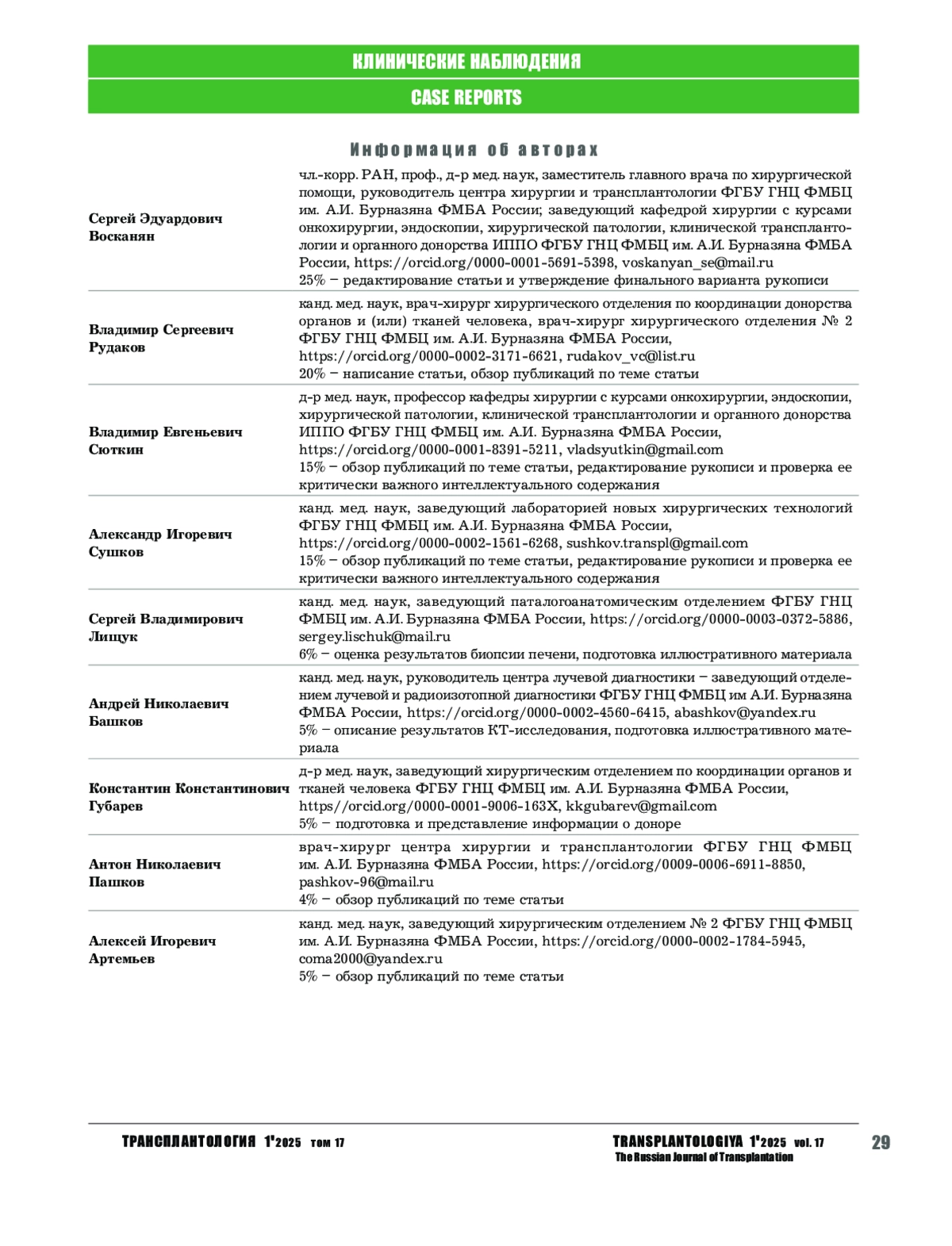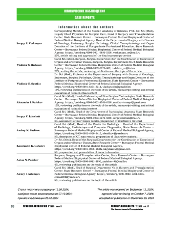 2. Восканян С.Э., Сушков А.И., Артемьев А.И., Рудаков В.С., Колышев И.Ю., Губарев К.К. и др. Программа трансплантации печени в Федеральном медицинском биофизическом центре им. А.И. Бурназяна: опыт 500 операций. Хирургия. Журнал им. Н.И. Пирогова. 2024;(7):45-60. DOI: 10.17116/hirurgia202407145