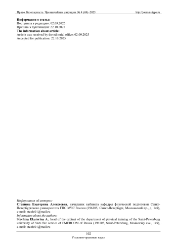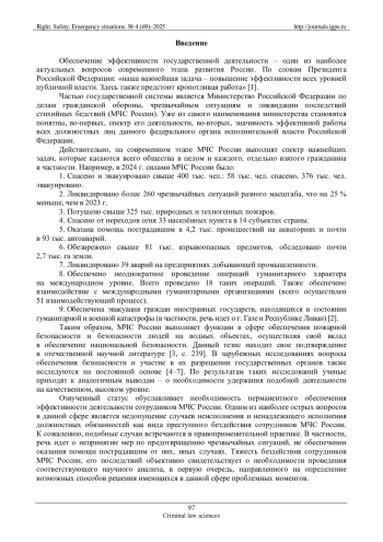 Обеспечена эвакуация граждан иностранных государств, находящихся в состоянии гуманитарной и военной катастрофы (в частности, речь идет о г. Газе и Республике Ливан) [2]. Таким образом, МЧС России выполняет функции в сфере обеспечения пожарной безопасности и безопасности людей на водных объектах, осуществляя свой вклад в обеспечение национальной безопасности. Данный тезис находит свое подтверждение в отечественной научной литературе [3, с. 239]. В зарубежных исследованиях вопросы обеспечения безопасности и участие в их разрешении государственных органов также исследуются на постоянной основе [4–7]. По результатам таких исследований ученые приходят к аналогичным выводам – о необходимости удержания подобной деятельности на качественном, высоком уровне.