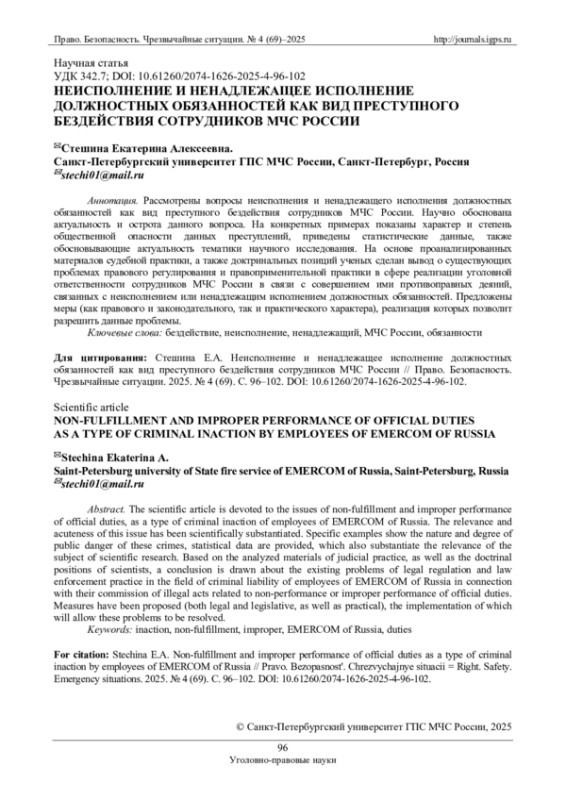 Рассмотрены вопросы неисполнения и ненадлежащего исполнения должностных обязанностей как вид преступного бездействия сотрудников МЧС России. Научно обоснована актуальность и острота данного вопроса. На конкретных примерах показаны характер и степень общественной опасности данных преступлений, приведены статистические данные, также обосновывающие актуальность тематики научного исследования. На основе проанализированных материалов судебной практики, а также доктринальных позиций ученых сделан вывод о существующих проблемах правового регулирования и правоприменительной практики в сфере реализации уголовной ответственности сотрудников МЧС России в связи с совершением ими противоправных деяний, связанных с неисполнением или ненадлежащим исполнением должностных обязанностей. Предложены меры (как правового и законодательного, так и практического характера), реализация которых позволит разрешить данные проблемы.