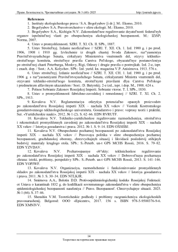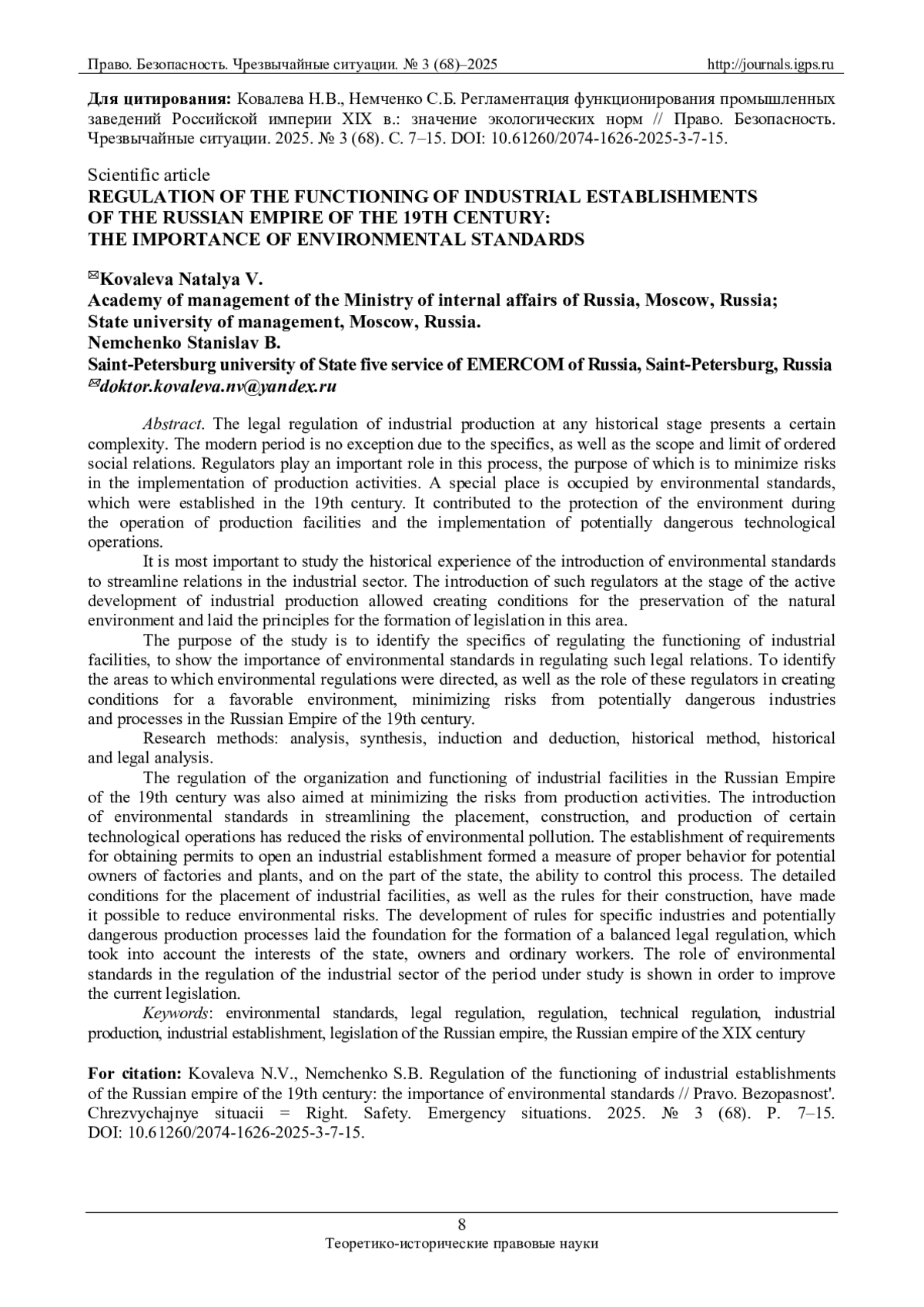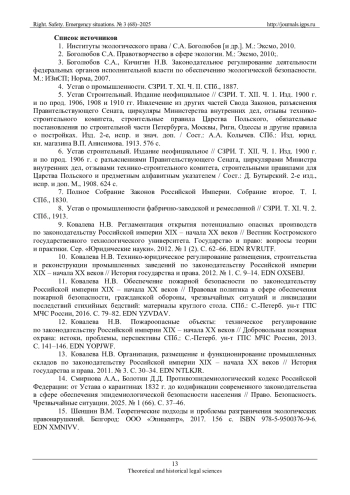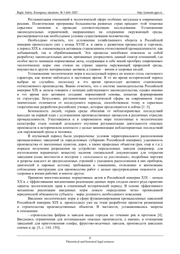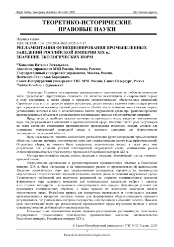 Правовое регулирование промышленного производства на любом историческом этапе представляет определенную сложность. Не является исключением и современный период в силу специфики, а также сферы и пределом упорядочиваемых общественных отношений. Серьезную роль в этом процессе играют регуляторы, целью которых является минимизация рисков при осуществлении производственной деятельности. Особое место занимают экологические нормы, установление которых в XIX в. способствовало защите окружающей среды при функционировании производственных объектов и осуществлении потенциально опасных технологических операций. Представляется наиболее важным изучение исторического опыта введения экологических норм для упорядочивания отношений в производственной сфере. Введение такого рода регуляторов на этапе активного становления промышленного производства позволило создать условия для сохранения окружающей природной среды и заложило принципы для формирования законодательства в данной области. Цель исследования: выявить особенности регламентации функционирования промышленных объектов, показать значение экологических норм при упорядочивании такого рода правоотношений. Определить сферы, на которые были направлены экологические нормы, а также роль этих регуляторов для создания условий благоприятной окружающей среды, минимизации рисков от потенциально опасных производств и процессов в Российской империи XIX в. Методы исследования: анализ, синтез, индукция и дедукция, исторический метод, историко-правовой анализ. Регламентация организации и функционирования промышленных объектов в Российской империи XIX в. была направлена и на минимизацию рисков от производственной деятельности. Введение экологических норм при упорядочивании размещения, строительства, производства определенных технологических операций позволило снизить риски загрязнения окружающей среды. Установление требований для получения разрешений на открытие промышленного заведения формировали меру должного поведения для потенциальных владельцев фабрик и заводов, а со стороны государства - возможность контролировать этот процесс. Детализация условий для размещения промышленных объектов, а также правила их возведения позволили снизить экологические риски. Разработка правил для конкретных производств и потенциально опасных производственных процессов заложило основу для формирования сбалансированного правового регулирования, где учитывались интересы государства, собственников и обычных рабочих. Показана роль экологических норм при регламентации промышленной сферы изучаемого периода с целью совершенствования действующего законодательства.
