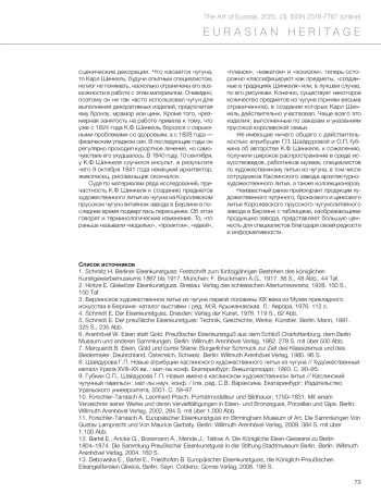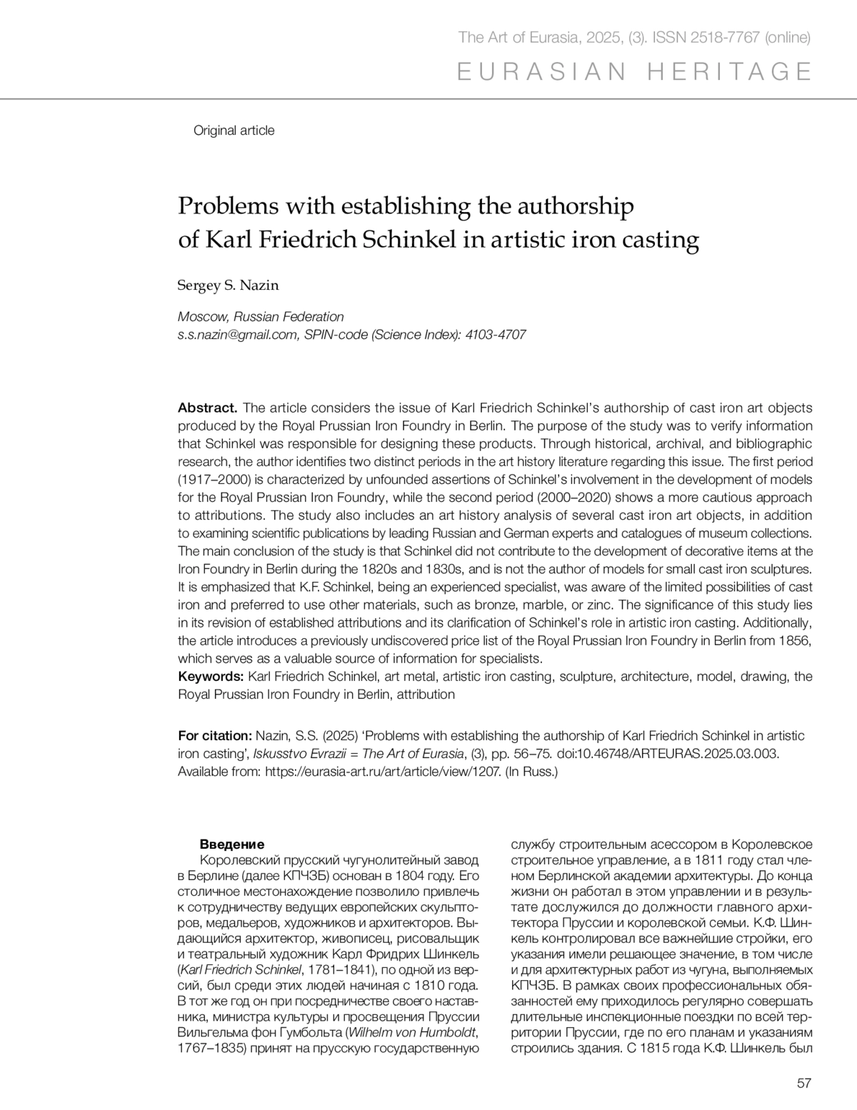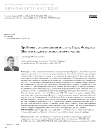 Назин С.С. Проблемы с установлением авторства Карла Фридриха Шинкеля в художественном литье из чугуна // Искусство Евразии [Электронный журнал]. 2025. No 3 (38).