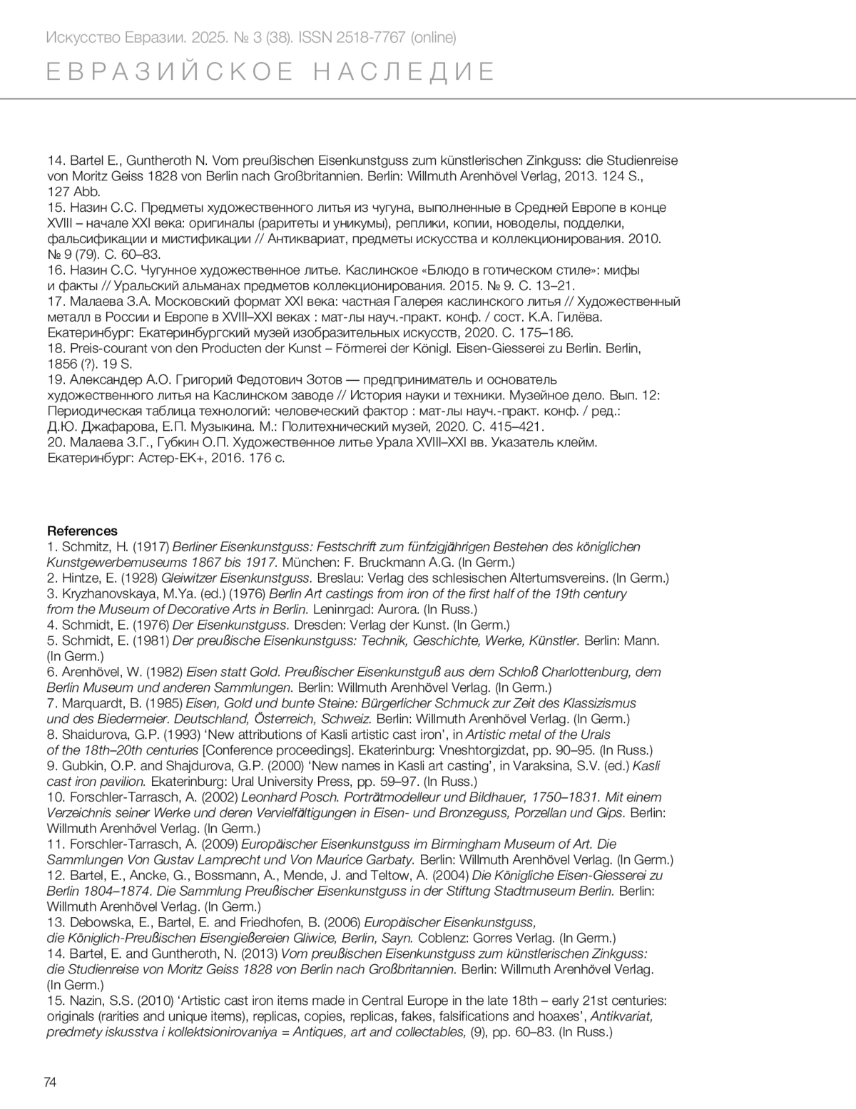 15. Nazin, S.S. (2010) ‘Artistic cast iron items made in Central Europe in the late 18th – early 21st centuries: originals (rarities and unique items), replicas, copies, replicas, fakes, falsifications and hoaxes’, *Antikvariat, predmety iskusstva i kollektsionirovaniya = Antiques, art and collectables*, (9), pp. 60–83. (In Russ.)