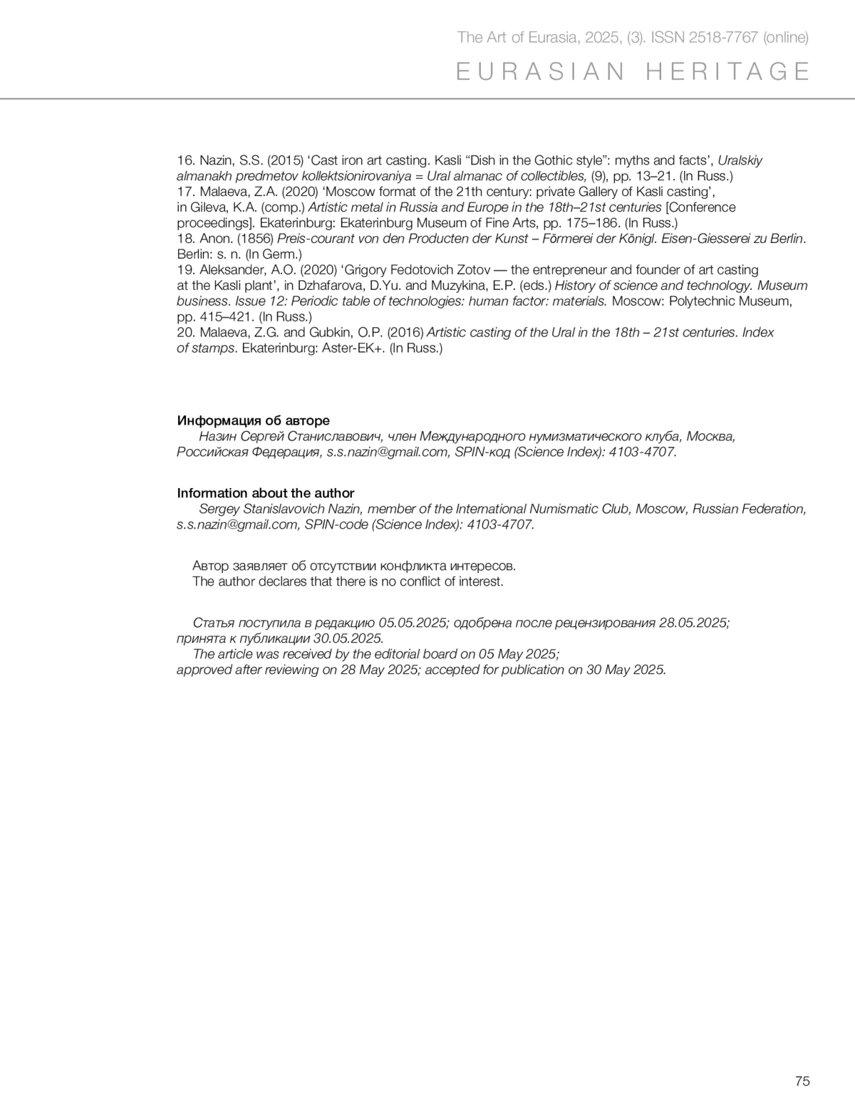 16. Nazin, S.S. (2015) ‘Cast iron art casting. Kasli “Dish in the Gothic style”: myths and facts’, *Uralskiy almanakh predmetov kollektsionirovaniya = Ural almanac of collectibles*, (9), pp. 13–21. (In Russ.)
