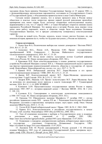 8. Климанов А.Ю. Представительные государственные органы России в период революции 1905-1907 гг.: историко-правовой аспект // Вестник МИЭП. 2016. № 1 (22). С. 108-124.