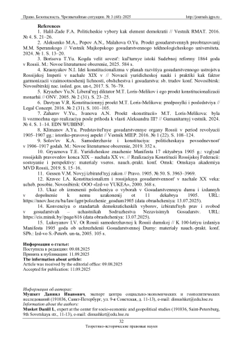 10. Грязнова Т.Е. Юридическое значение Манифеста 17 октября 1905 г.: взгляд российских правоведов конца XIX - начала XX вв. // Реализация Конституции Российской Федерации: состояние и перспективы: материалы всерос. науч.-практ. конф. Омск: Омская академия МВД России, 2019. С. 15-16. EDN: UKLAUE