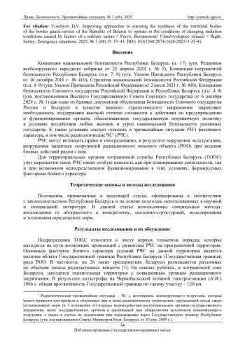 Концепция национальной безопасности Республики Беларусь (п. 17) (утв. Решением всебелорусского народного собрания от 25 апреля 2024 г. № 5), Концепция пограничной безопасности Республики Беларусь (п. п. 7, 8) (утв. Указом Президента Республики Беларусь от 16 октября 2018 г. № 410), Стратегия национальной безопасности Российской Федерации (п. п. 4–9) (утв. Указом Президента Российской Федерации от 2 июля 2021 г. № 400), Концепции безопасности Союзного государства Российской Федерации и Республики Беларусь (п. п. 4–9) (утв. постановлением Высшего Государственного Совета Союзного государства от 6 декабря 2024 г. № 1) как одни из базовых документов обеспечения безопасности Союзного государства России и Беларуси в качестве важного стратегического направления закрепляют необходимость поддержания высокой степени готовности к действиям по предупреждению и функционированию органов, обеспечивающих государственную пограничную политику в условиях воздействия любых вызовов и угроз национальной безопасности указанных государств. К таким условиям следует относить и чрезвычайные ситуации (ЧС) различного характера, в том числе радиологические ЧС (РЧС).