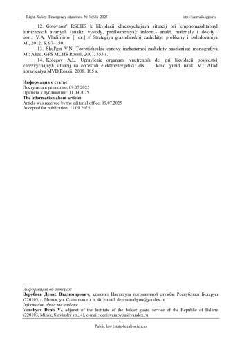 7. Совершенствование работы должностных лиц ТОПС в условиях возникновения ЧС на БелАЭС: отчёт о НИР (заключ.) / Ин-т погранич. службы Респ. Беларусь; рук. Щербаков И.В.; исполн.: Воробьёв Д.В. [и др.]. Минск, 2022. 189 с. № НД-0301-2023/ав.